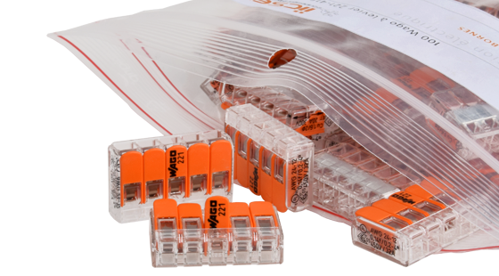 Connecteurs Wago : la gamme mini encombrement, à levier ou à enfichage direct, en 2, 3 et 5 bornes. Barettes de connexions à vis à fixer ou sécables.