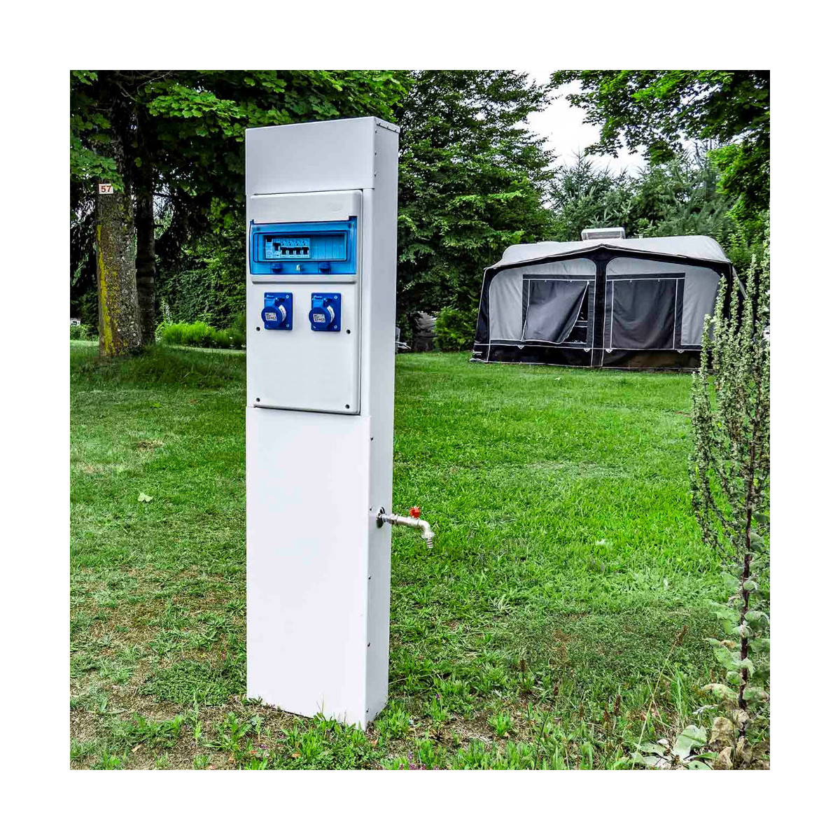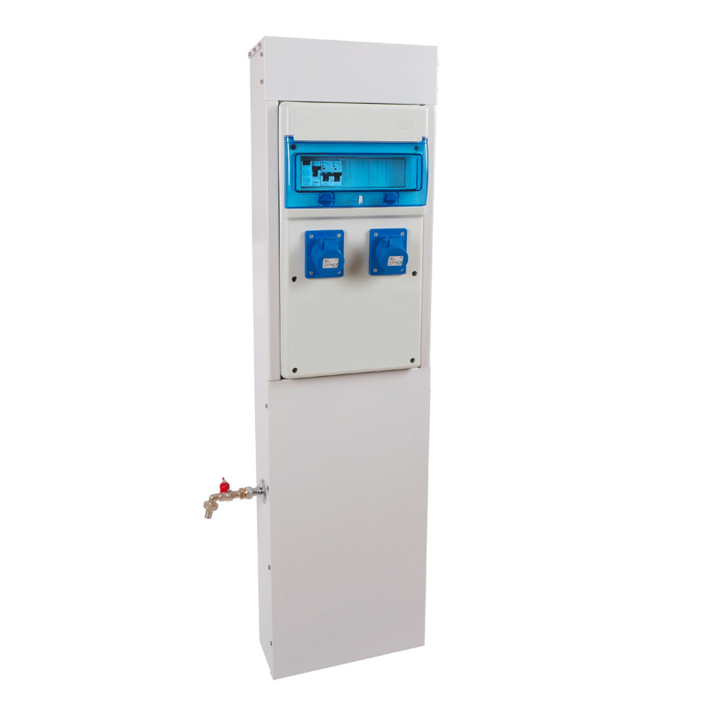 • Borne de camping métallique avec 2 prises 10A + 1 robinet