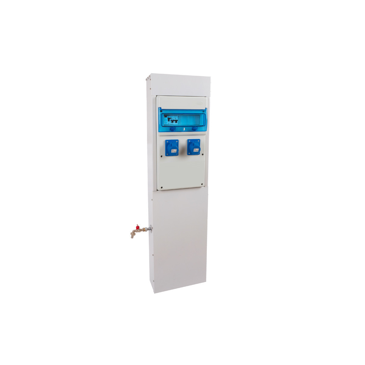 Borne de camping métallique électrique avec 2 prises CEE et les protections électriques et 1 robinet pour 1 ou 2 emplacements caravaning. Permet d'alimenter tout type de système muni d'une fiche en 230V.
