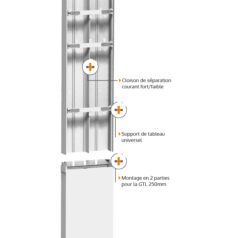 - 2 capots (1300x250mm), 1 connecteur d’assemblage des 2 parties de GTL, 1 cloison de séparation utile pour le courant fort/faible, 6 supports pour tableaux fournis, 4 brides pour câbles fournis