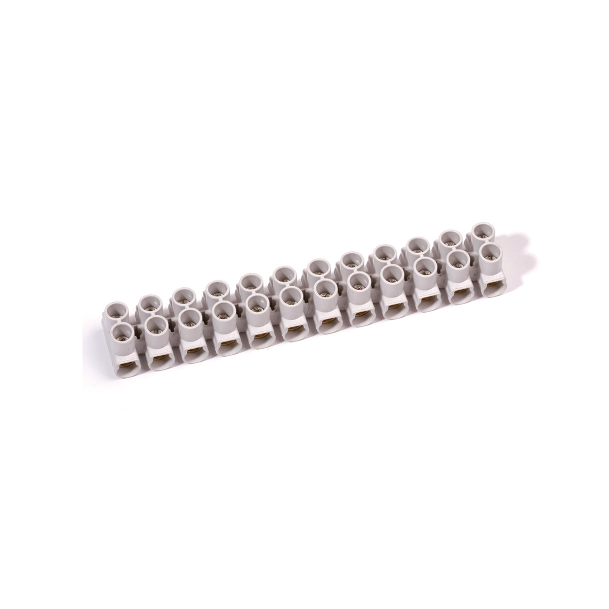 12 connexions sécables par barrette à fixer ou à visser sur un support ou dans une boîte de dérivation. Pour fil de section importante. Il est utile de fixer la connexion sur un support lorsque les câbles de grande section effectuent des efforts à maintenir dans la connexion.