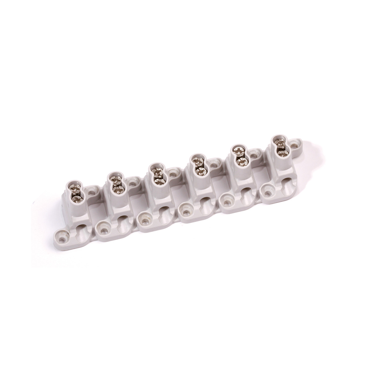 6 connexions sécables par barrette à fixer ou à visser sur un support ou dans une boîte de dérivation. Pour fil de section importante. Il est utile de fixer la connexion sur un support lorsque les câbles de grande section effectuent des efforts à maintenir dans la connexion.