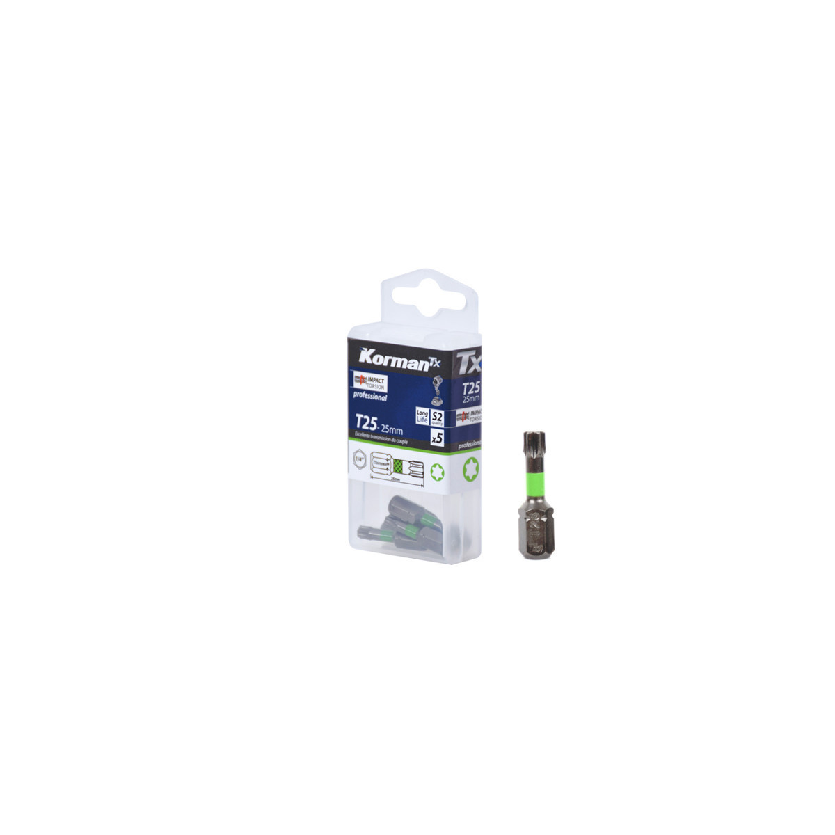 Embouts Torx haute résistance T25 matériel S2. Les embouts Impact torsion supportent les vitesses et couples élevés de visseuses à percussion et résistent sans déformation.