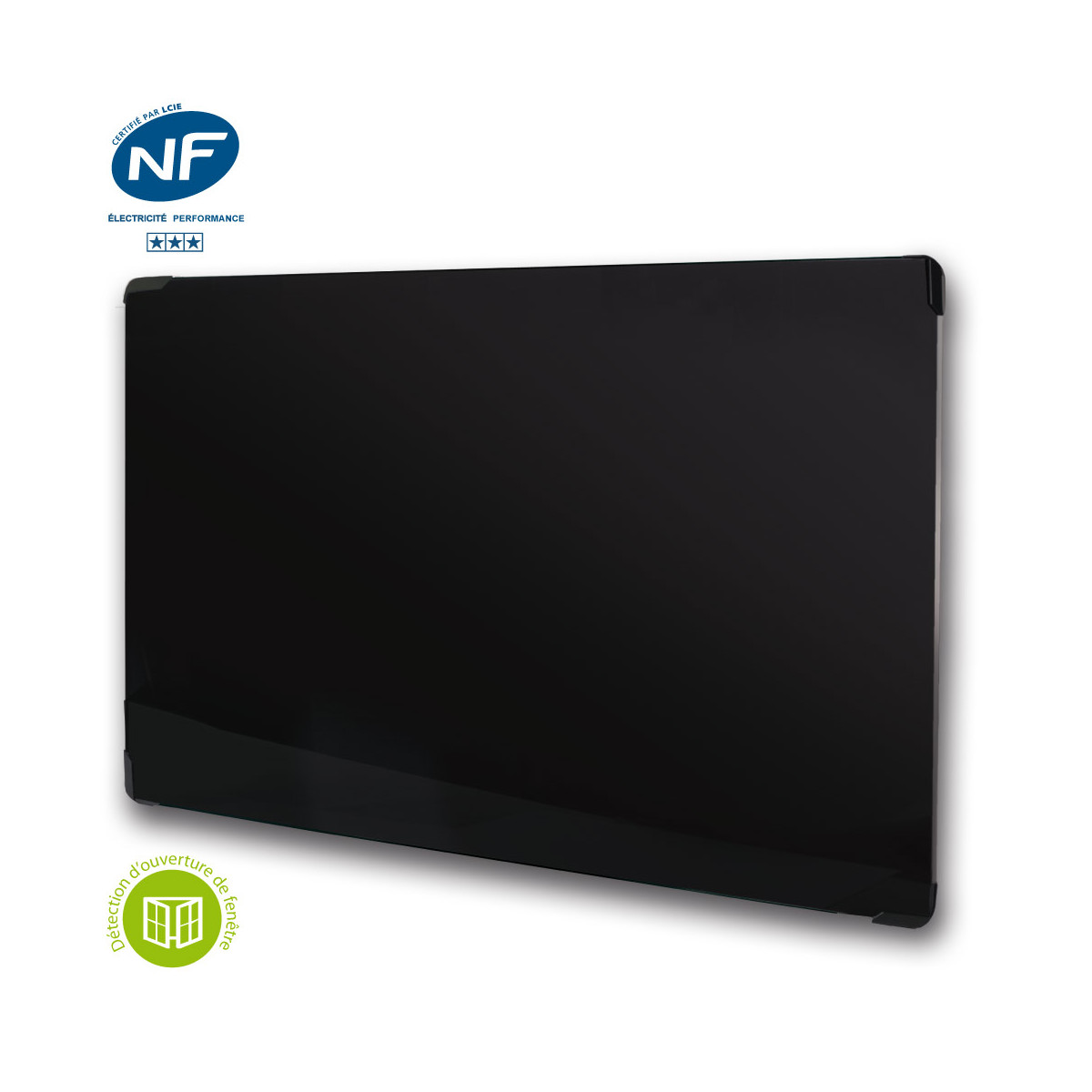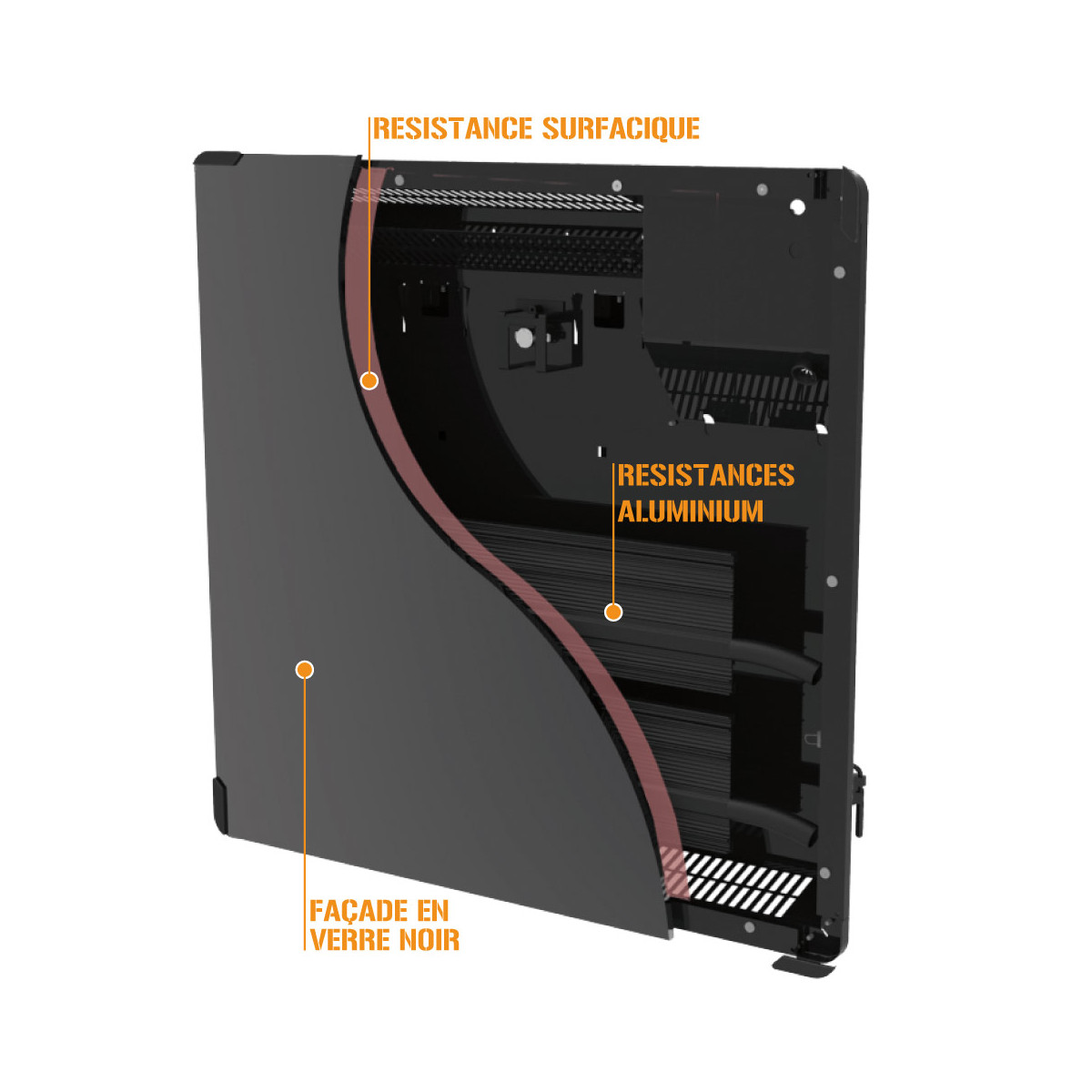 Radiateur à convection programmable, avec façade en verre noir. NF Performance, avec détection d'ouverture de fenêtre. Double système de chauffe, montée rapide en température. Il se compose de résistance en aluminium et d'une résistance surfacique qui va rayonner sur la surface en verre. Thermostat DELTADORE INSIDE 6 ordres à fil pilote programmable à 0,1°c près. L'esthétique et la performance au service du confort. 2 dimensions pour toute la gamme pour harmoniser le produit dans votre intérieur.