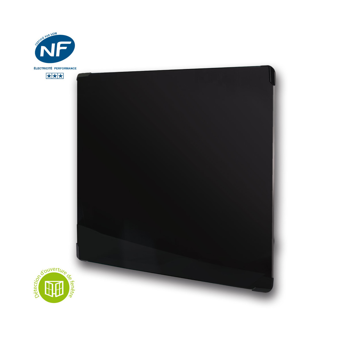 Radiateur à convection programmable, avec façade en verre noir. NF Performance, avec détection d'ouverture de fenêtre. Double système de chauffe, montée rapide en température. Il se compose de résistance en aluminium et d'une résistance surfacique qui va rayonner sur la surface en verre. Thermostat DELTADORE INSIDE 6 ordres à fil pilote programmable à 0,1°c près. L'esthétique et la performance au service du confort. 2 dimensions pour toute la gamme pour harmoniser le produit dans votre intérieur.