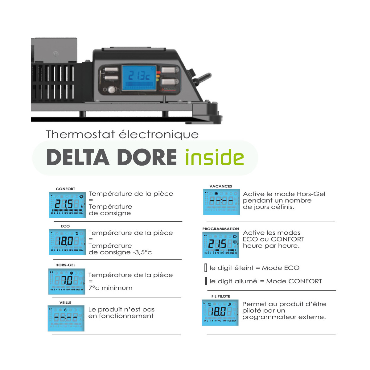 - Montée rapide en température. Température homogène sur toute la surface du radiateur. Fonction du thermostat: eco, confort, hors gel, STOP. Fonction détection d'ouverture de fenêtre. Programmation hebdomadaire.