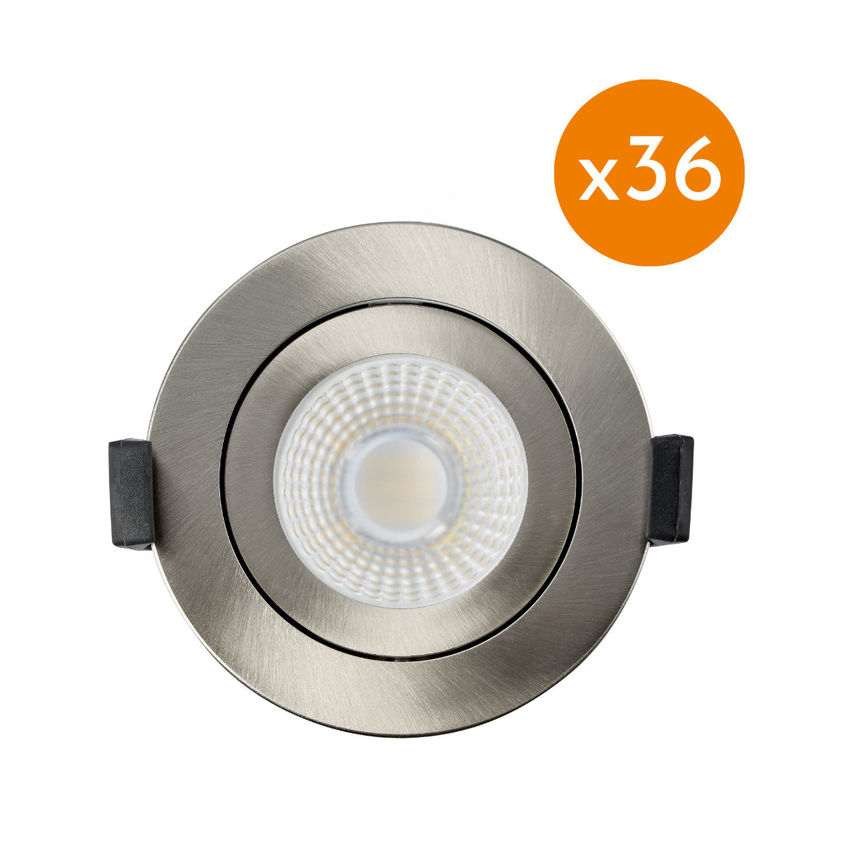 Pack comprenant 36 spots alu brossé à encastrer, fixe, variable et recouvrable. Compatible RT2012.