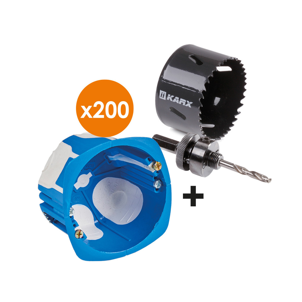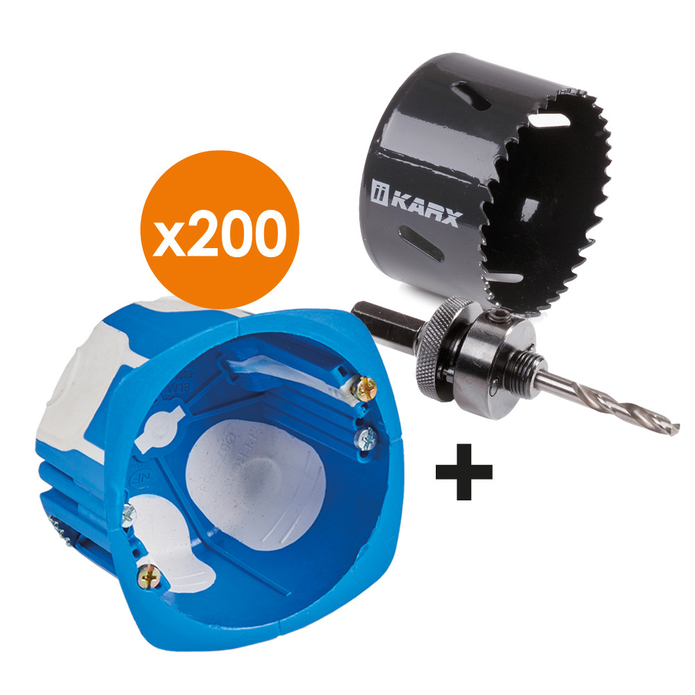 Pack comprenant 200 boîtes d'encastrement BBC 1 poste + 1 scie cloche Ø68mm + adaptateur avec forêt de centrage