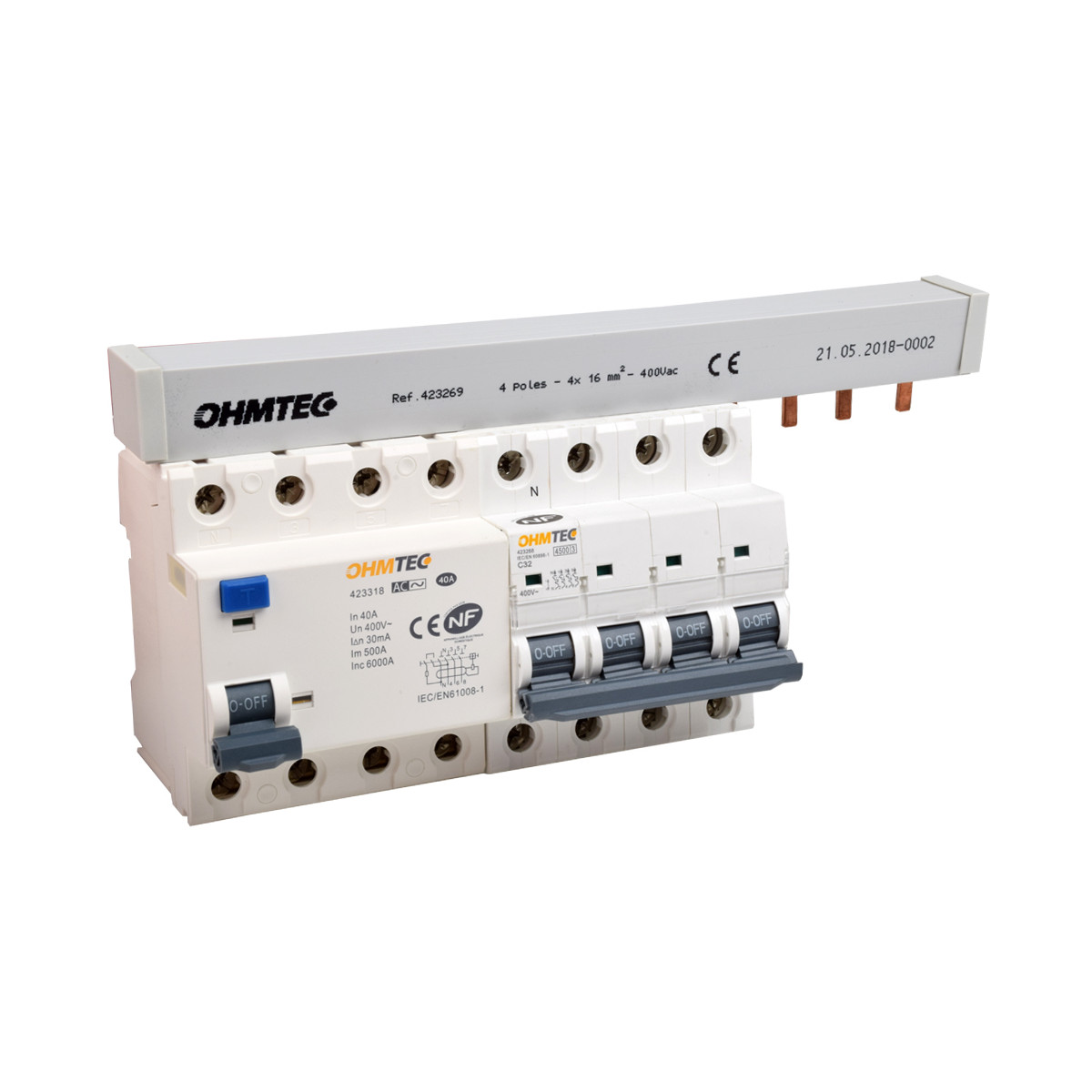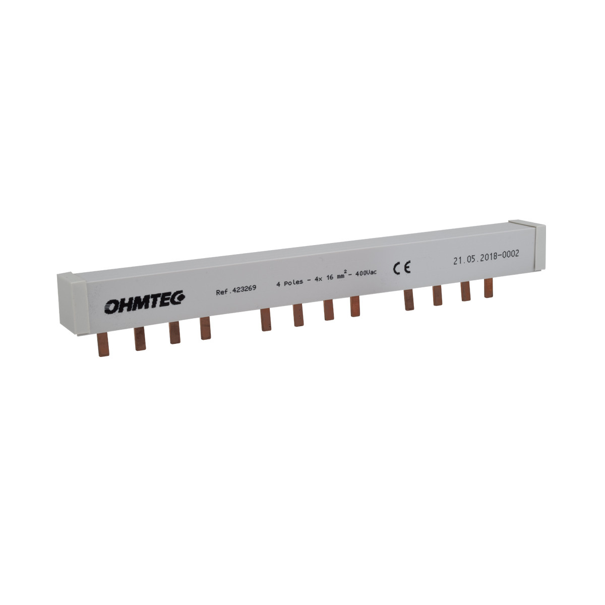 Cette barre de pontage tétrapolaire OHMTEC permet le pontage d'un interrupteur différentiel et de 2 disjoncteurs tétrapolaires OHMTEC (soit 12 modules).