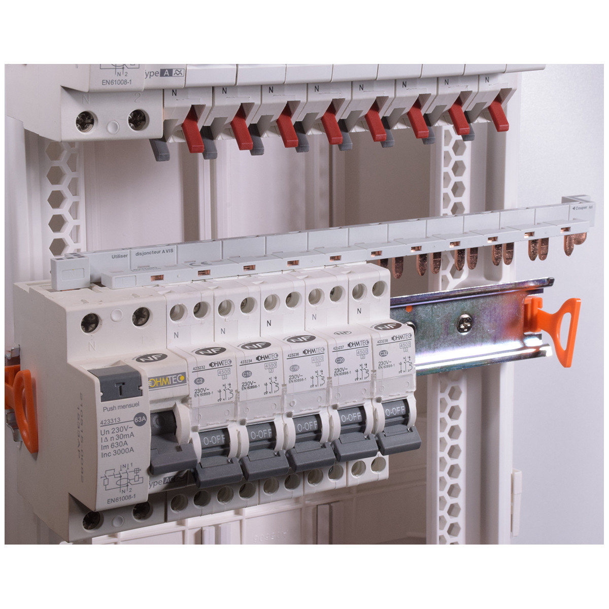 Cette barre de pontage universelle OHMTEC permet le pontage Phase et Neutre d'un interrupteur différentiel et d'une rangée de disjoncteurs 4,5kA automatiques (jusqu'à 11), ou d'une rangée de disjoncteurs 4.5kA à vis (jusqu'à 11).