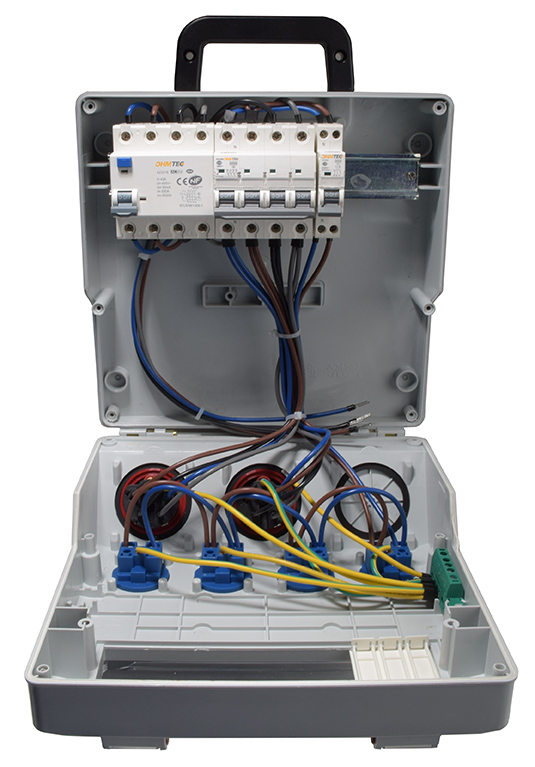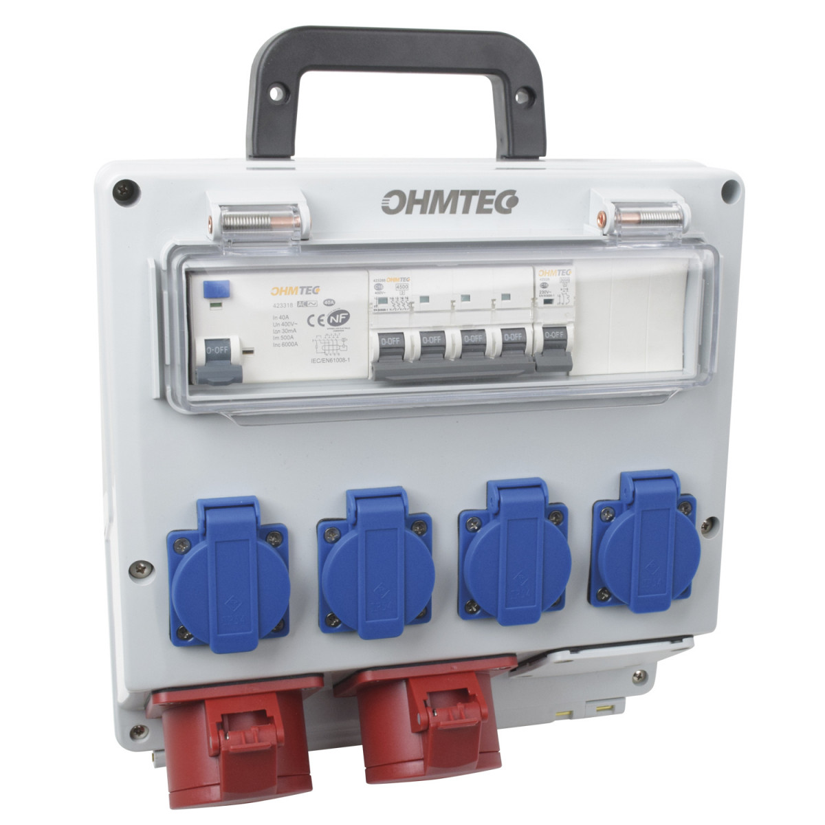 - 4 prises 2P+T 16A à clapet, 2 prises 3P+N+T 16A à clapet, 1 interrupteur différentiel tétrapolaire 40A type AC 30 mA, 1 disjoncteur tétrapolaire 16A, 1 disjoncteur monophasé 16A.