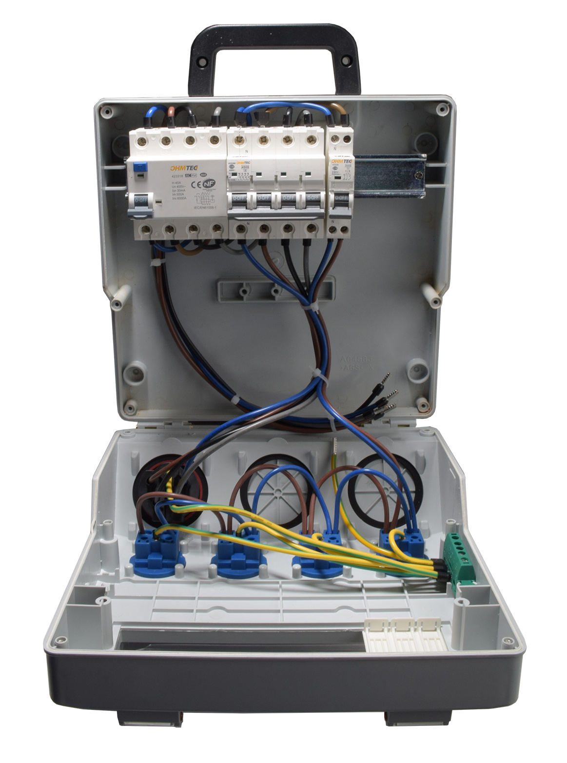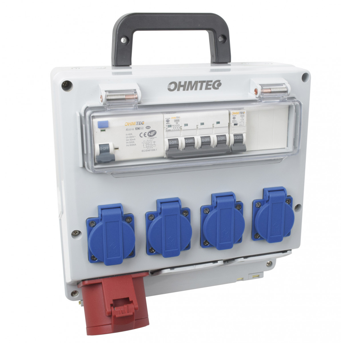- 4 prises 2P+T 16A à clapet, 1 prise 3P+N+T 32A à clapet, 1 interrupteur différentiel tétrapolaire 40A type AC 30 mA, 1 disjoncteur tétrapolaire 32A, 1 disjoncteur monophasé 16A.