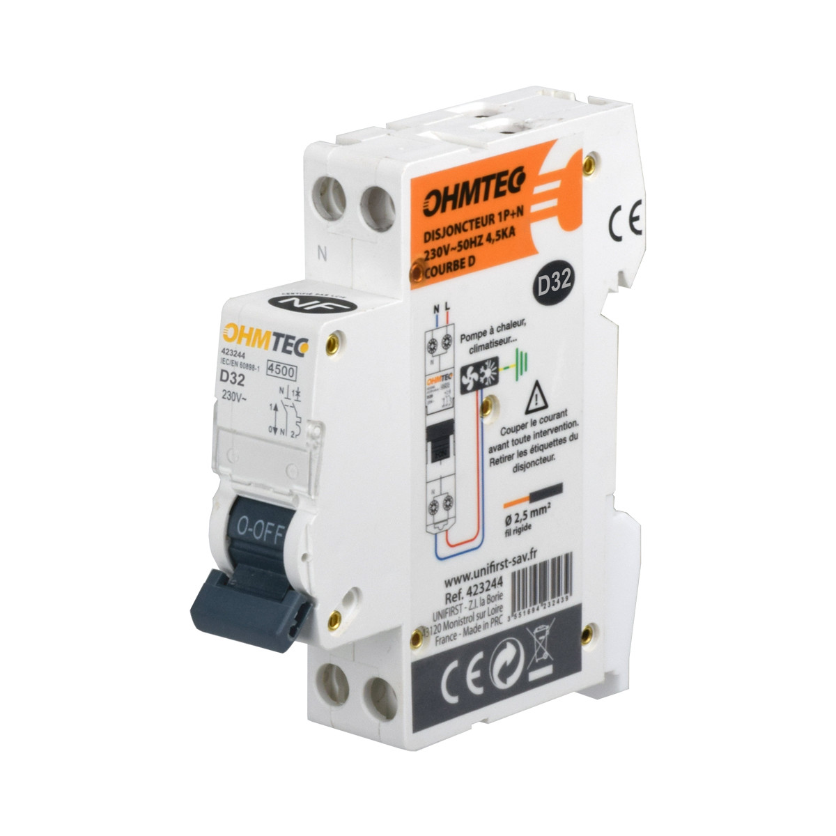 Disjoncteur 32A 1P+N courbe D OHMTEC. Conforme à la norme EN 60898-1.