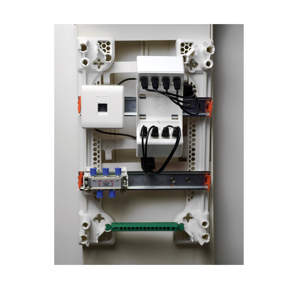 Coffret de communication équipé, qui permet l'organisation des différents réseaux de communication dans l'habitat- signal internet, téléphone et répartition du signal TV. Permet une installation Wi-Fi, et une répartition du TEL analogique suivant 4 connecteurs RJ45, ainsi que l'arrivée et le départ de câble coaxial TV. Coffret compatible pour recevoir la fibre optique.