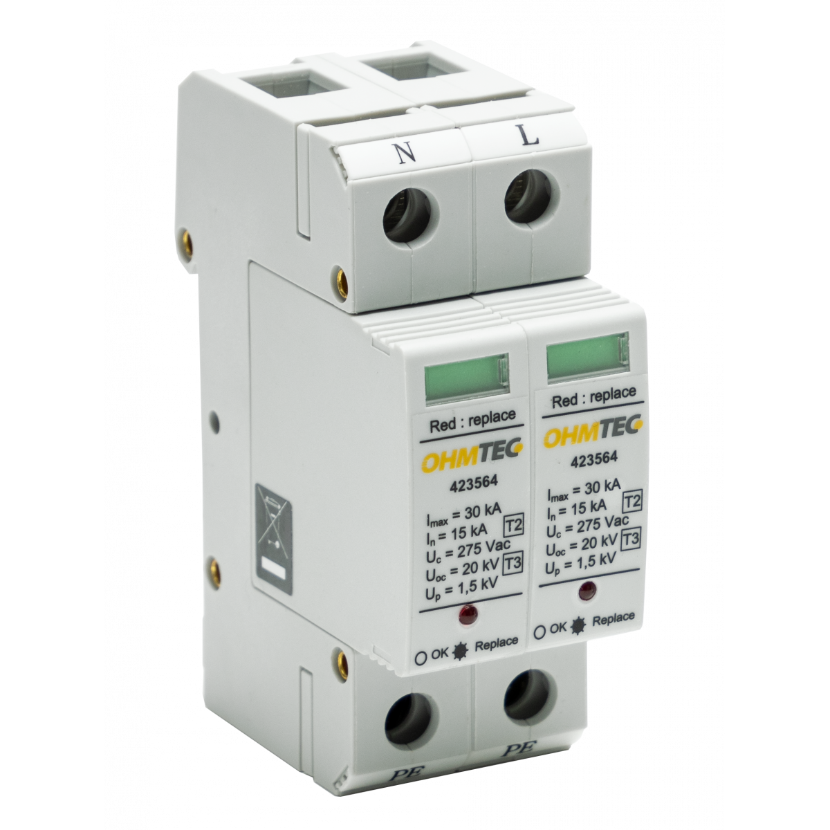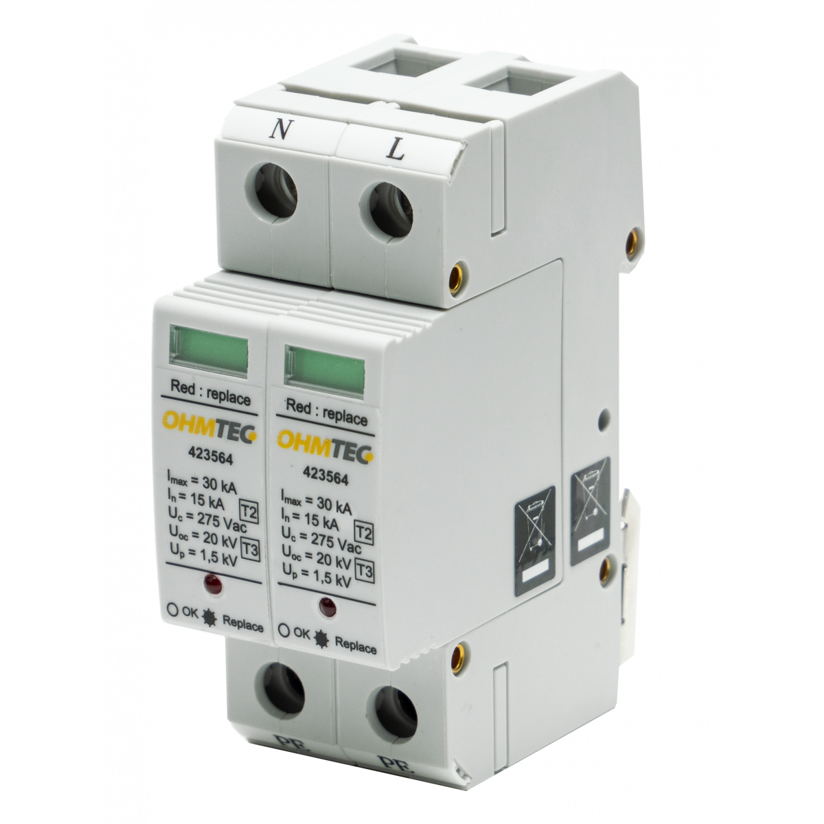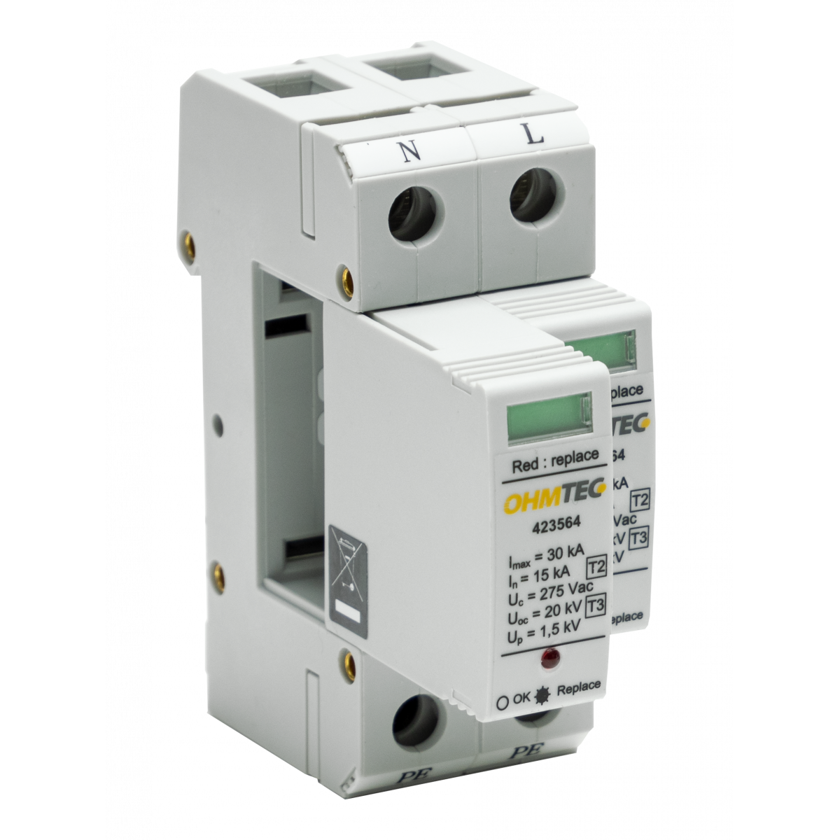Ce parafoudre monophasé OHMTEC avec cartouche débrochable permet la protection de l'installation électrique contre les courants liés à la foudre. La cartouche de ce parafoudre OHMTEC peut être changée sans toucher au câblage du parafoudre. Un témoin de validation de fonctionnement sur la cartouche est présent en façade. Le déconnecteur est intégré au parafoudre monophasé OHMTEC.