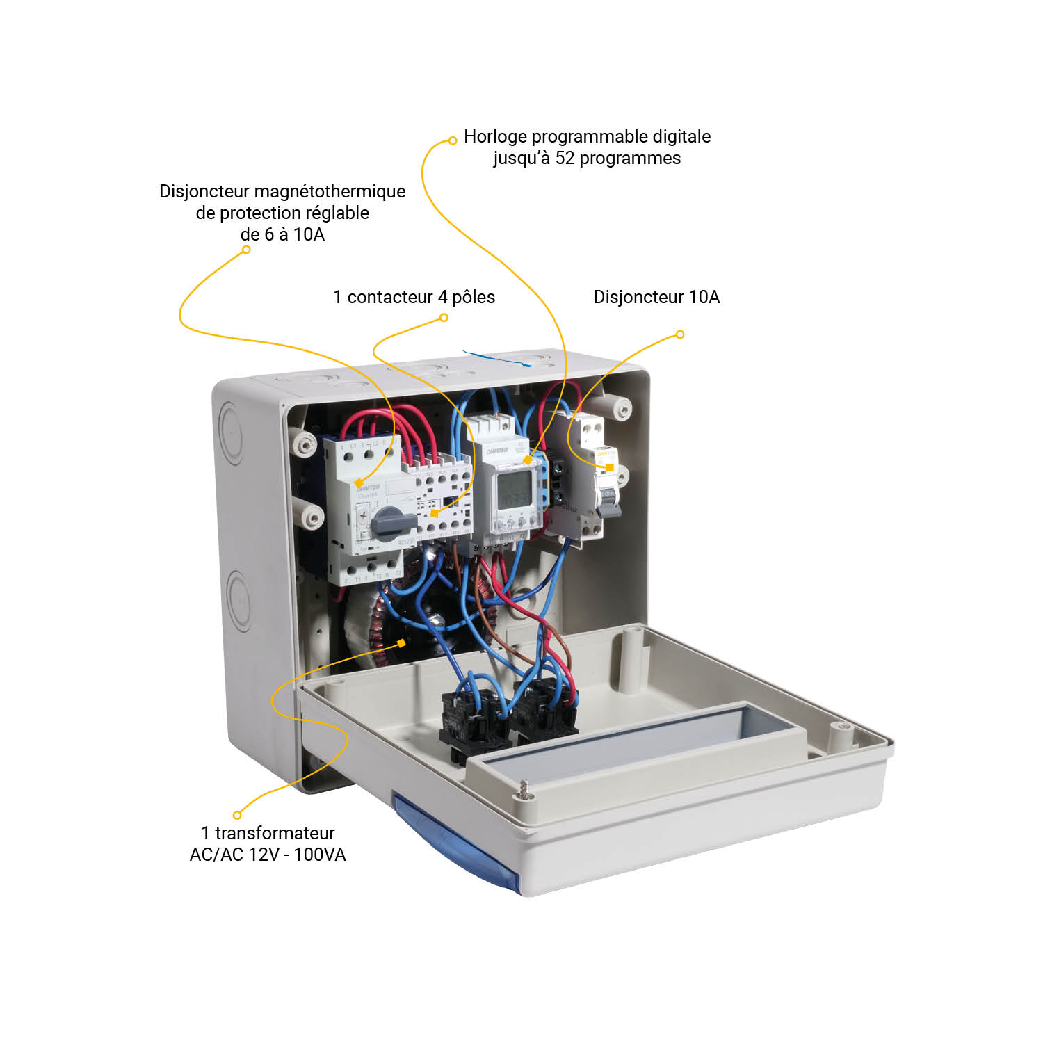 - 1 disjoncteur magnétothermique réglable de 6 à 10A, 1 contacteur 4 Pôles, 1 horloge digitale programmable, 1 disjoncteur 10A, 1 transformateur torique AC/DC 12V-100VA, 1 bornier Phase/Neutre/Terre, 2 sélecteurs et 1 presse étoupe.