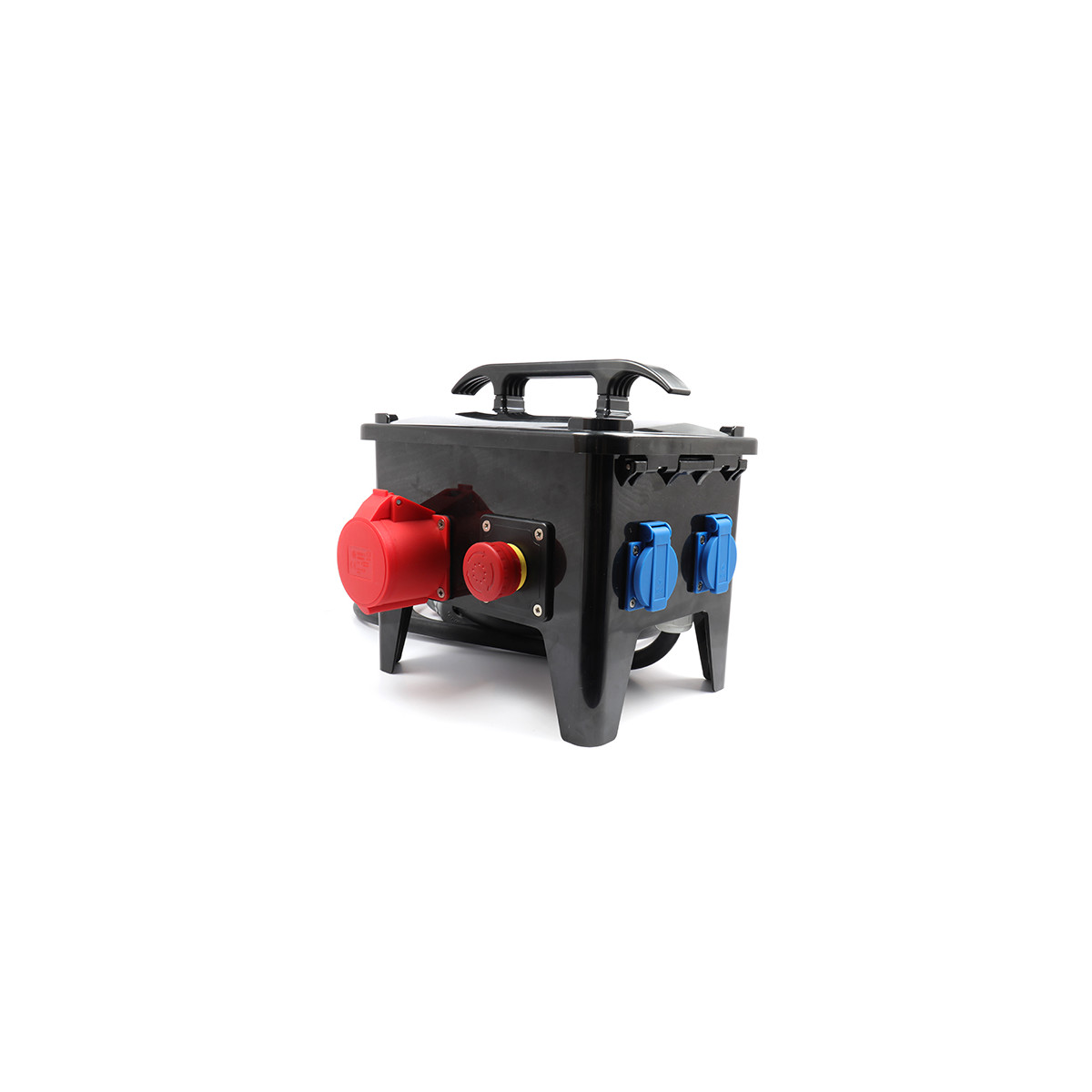 Coffret de chantier transportable. Il est fourni pré-équipé et pré-câblé et assure la protection électrique lors de vos travaux, avec un dispositif d'arrêt d'urgence intégré.