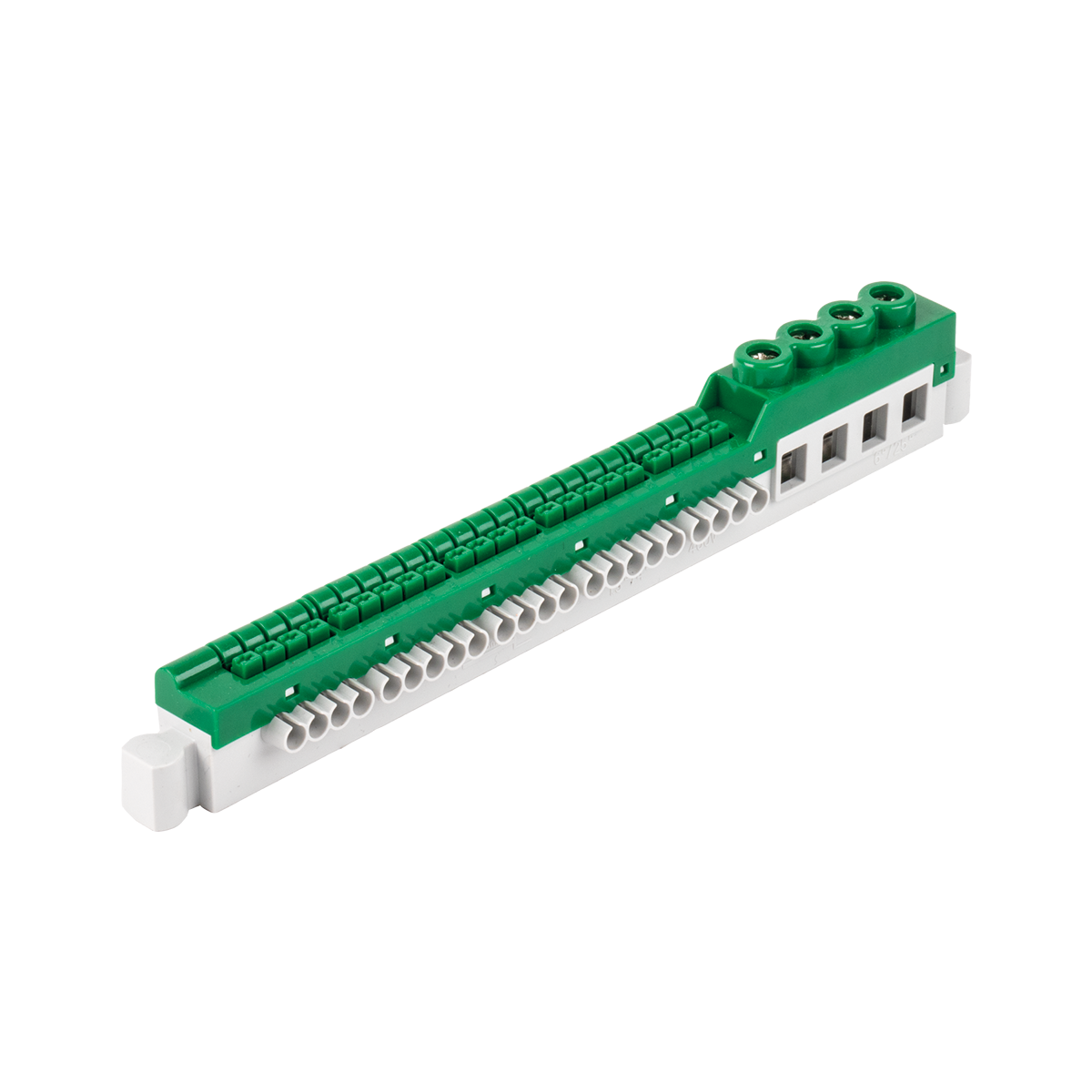Ce bornier de terre OHMTEC à connexion rapide offre des bornes de repiquage supplémentaires. Il est clipsable sur rail DIN ou positionnable dans les emplacements prévus des tableaux OHMTEC