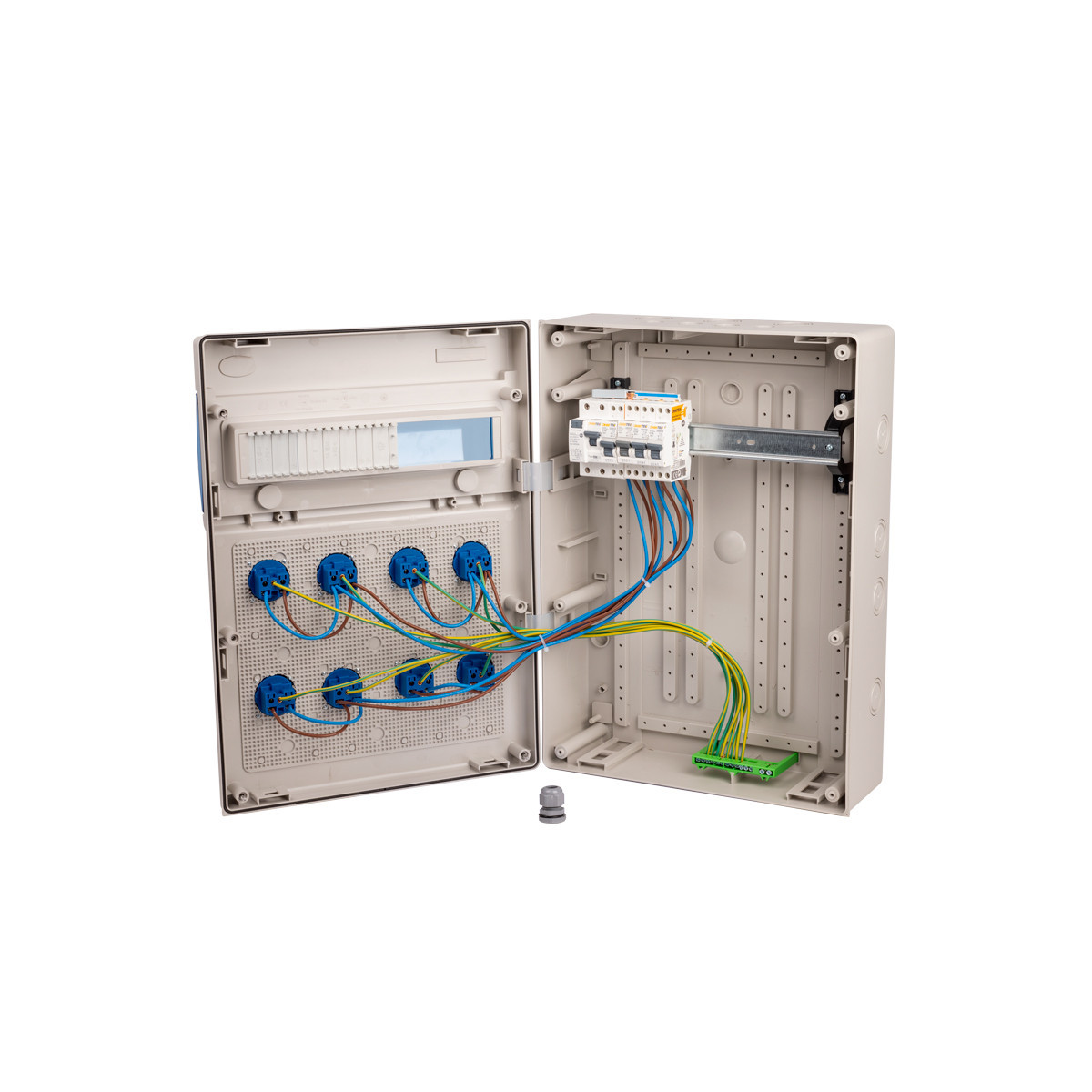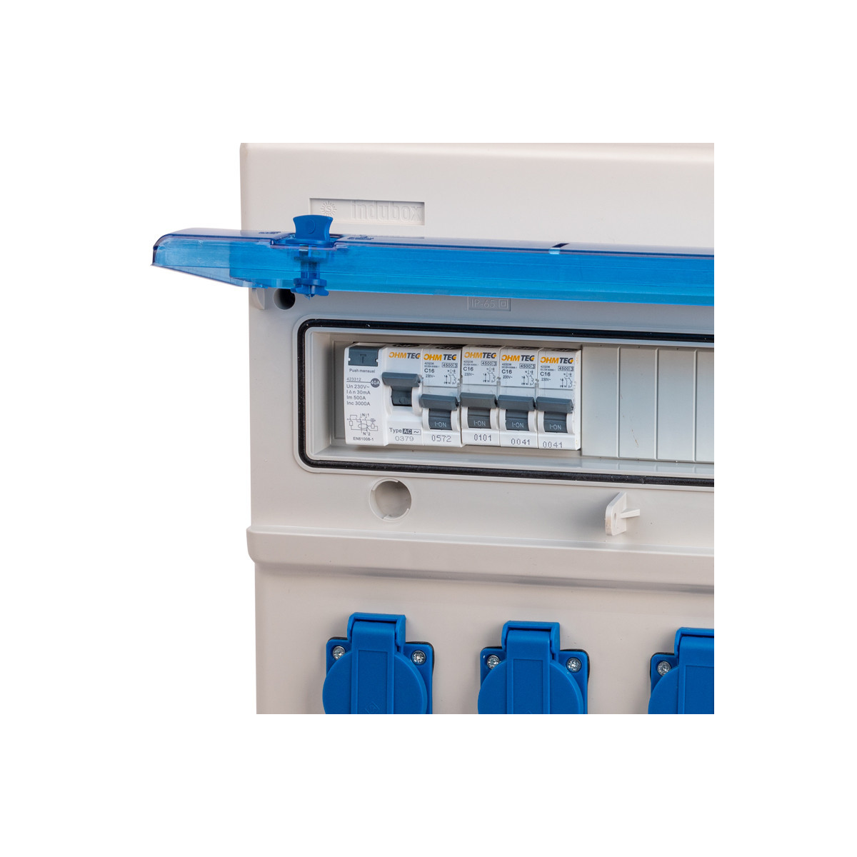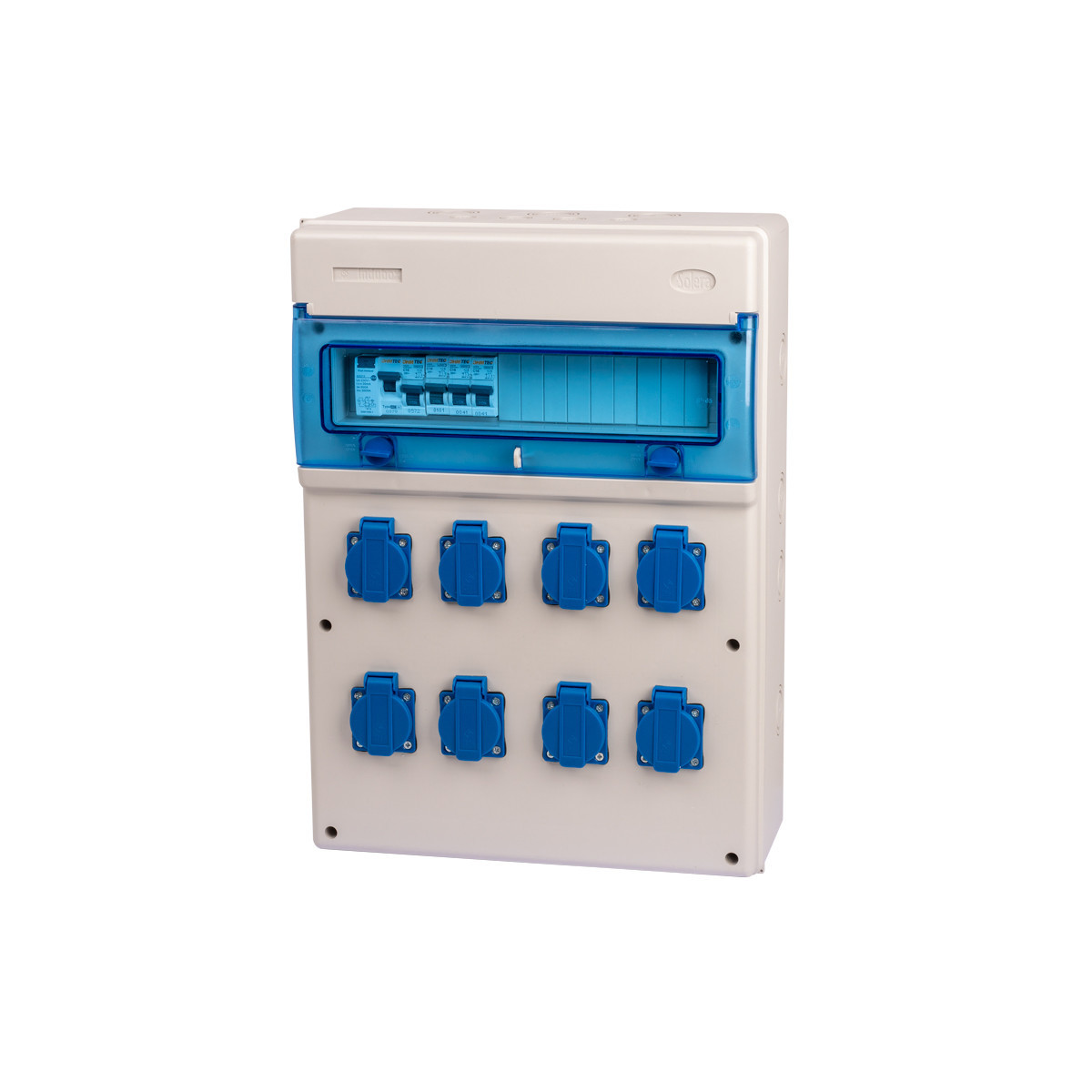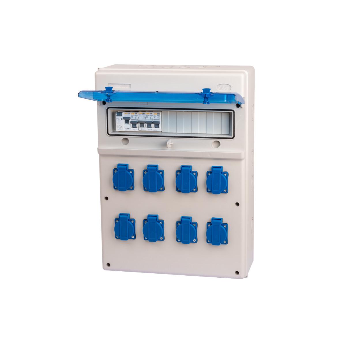 - 1 interrupteur différentiel 40A type AC, 4 disjoncteurs 1P+N 16A, 1 presse étoupe M20 et 8 prises 16A 2P+T à clapet