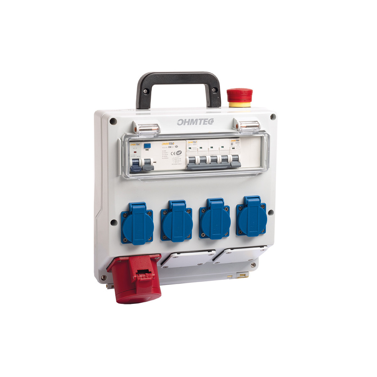 - 4 prises 2P+T 16A à clapet, 1 prise 3P+N+T 32A à clapet, 1 interrupteur différentiel tétrapolaire 40A type AC 30mA, 1 disjoncteur tétrapolaire 32A, 1 disjoncteur monophasé 16A et 1 arrêt d'urgence avec 1 bobine MX