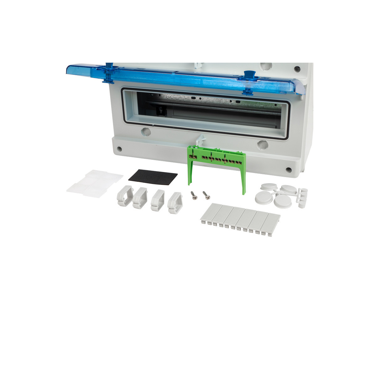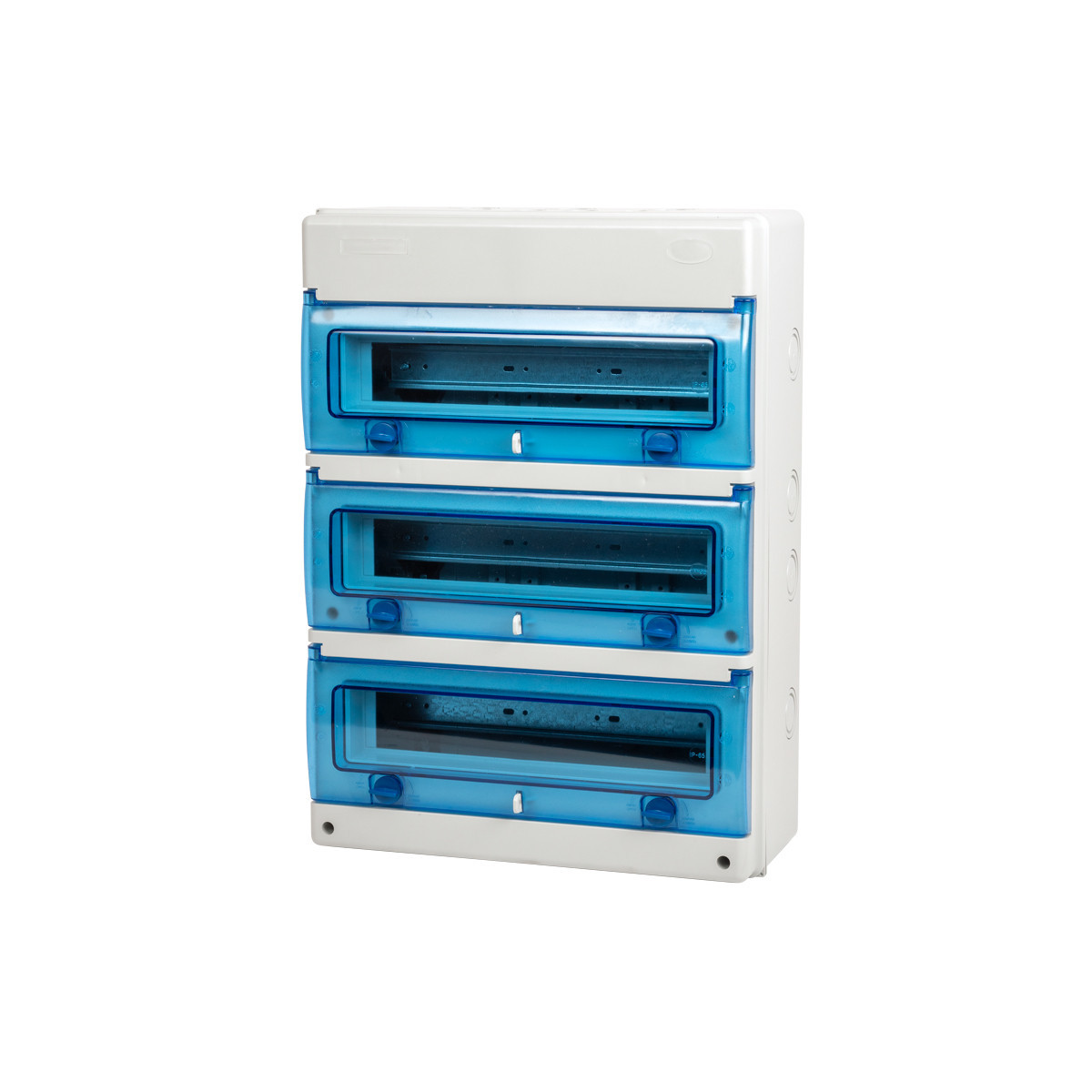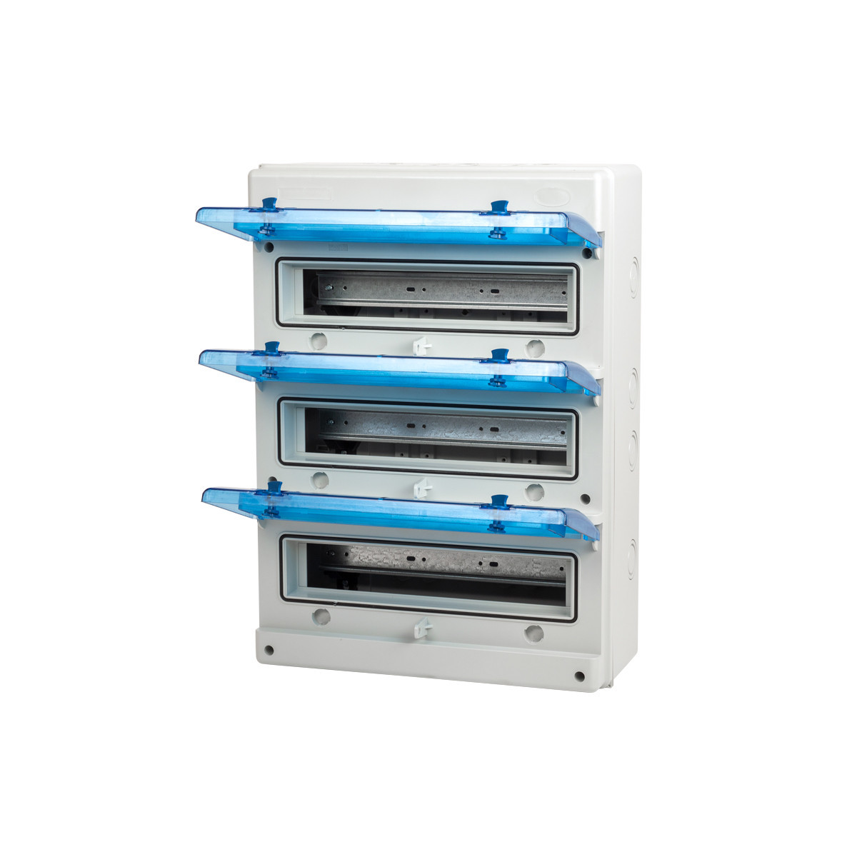 Ce tableau électrique étanche OHMTEC nu 3 rangées est prévu pour un montage en saillie. Il est équipé d'une fenêtre étanche à fermeture par 1/4 de tour. Le verrouillage des fenêtres est possible ainsi que le plombage de la façade