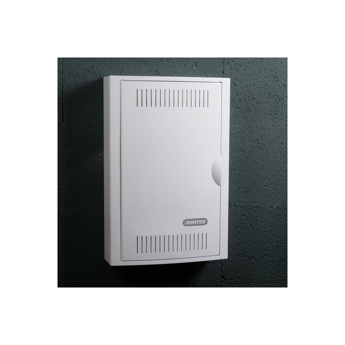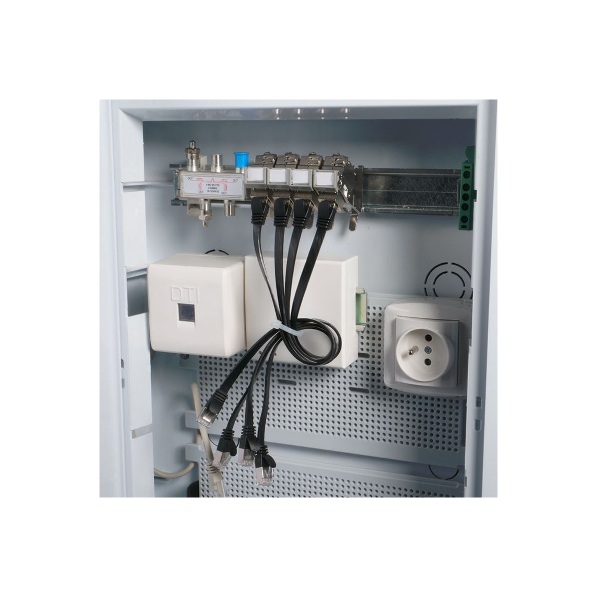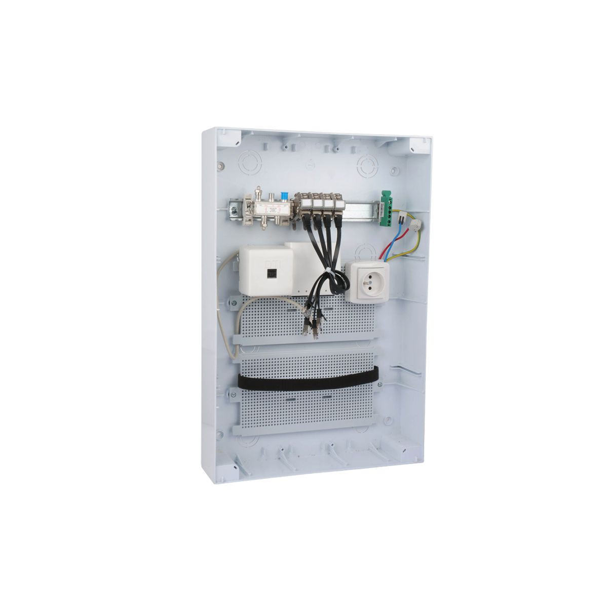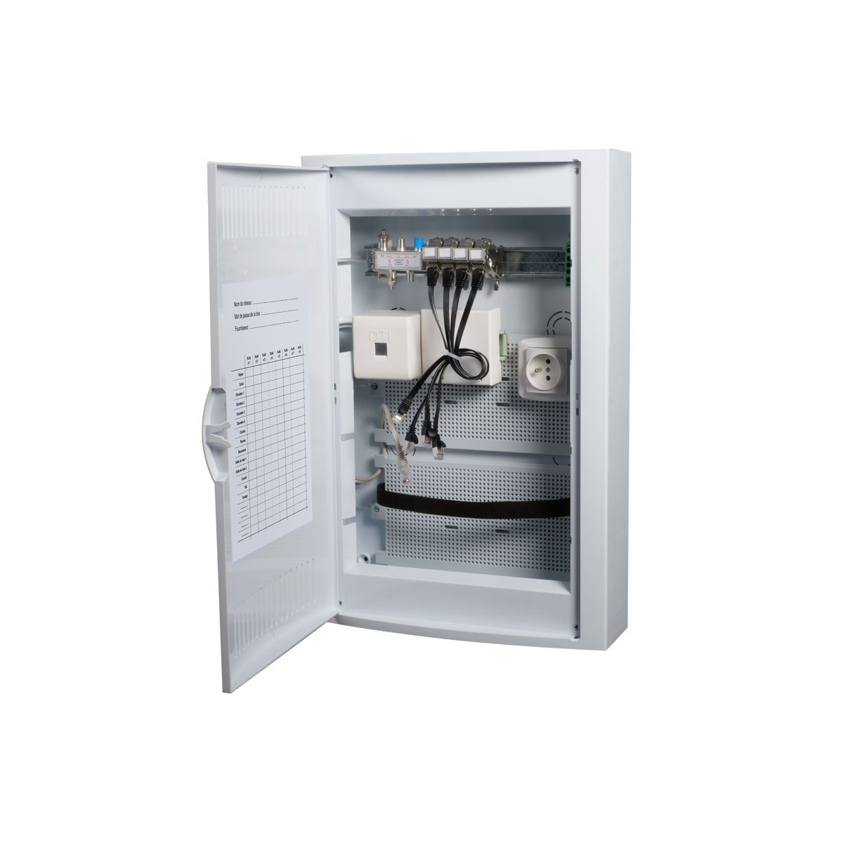 Ce coffret de communication OHMTEC est conçu pour le câblage de l'arrivée téléphonique, des antennes terrestres TNT/SAT, et d'un réseau internet fibre optique composé de 4 connecteurs RJ45 CAT6 (possibilité d'ajouter 4 connecteurs supplémentaires).