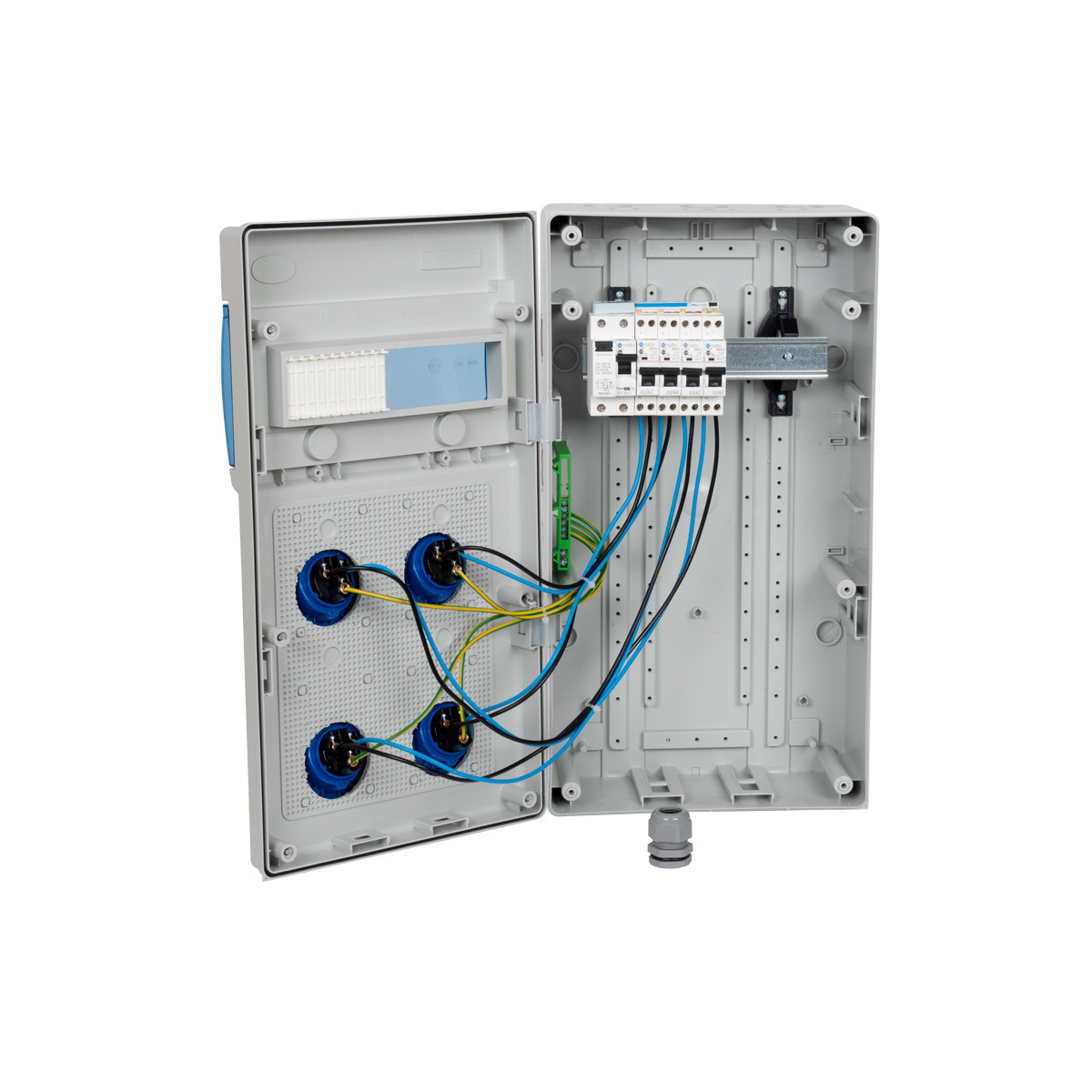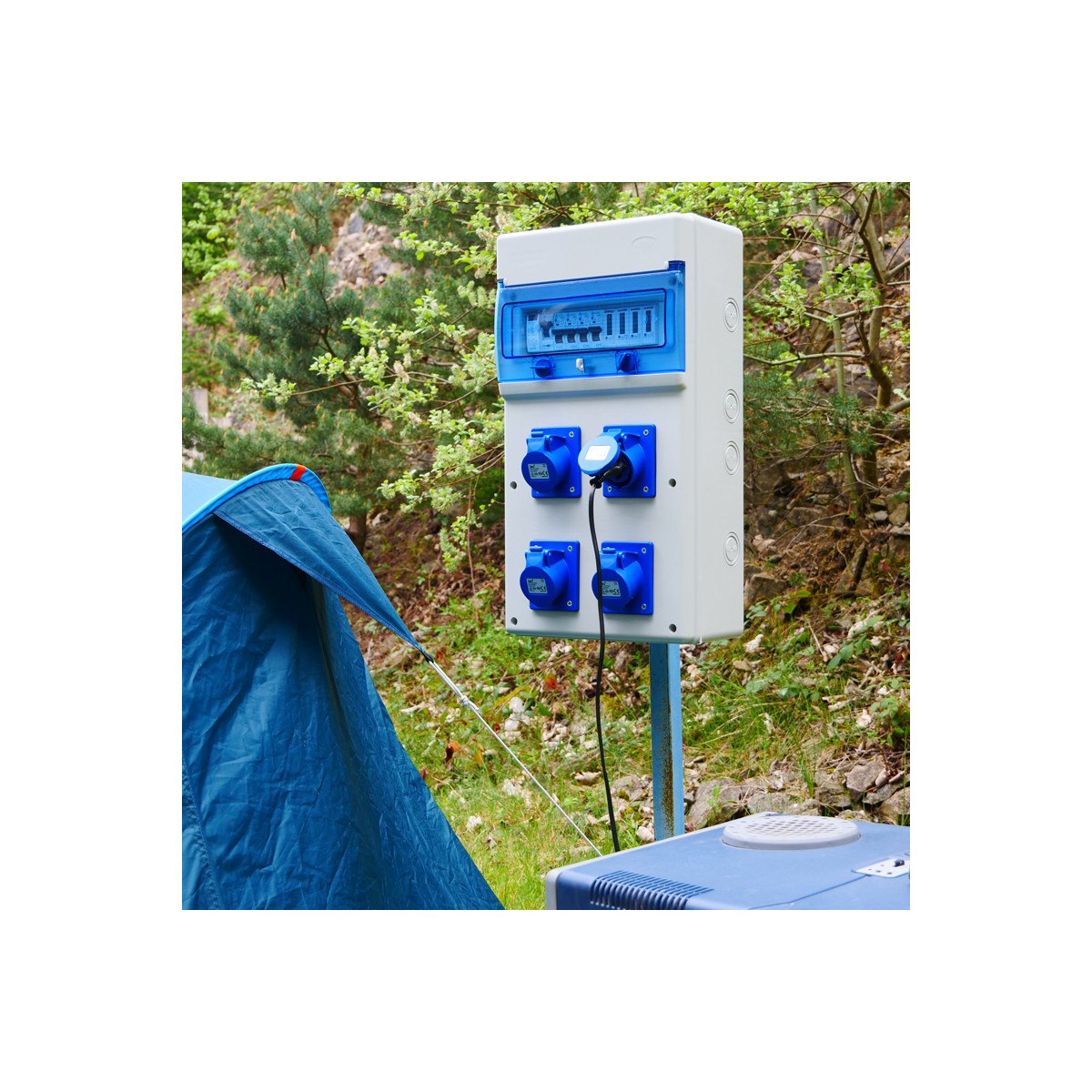 Ce coffret de camping OHMTEC muni de 4 prises indépendantes, est destiné à alimenter tout équipement de caravaning. Borne de raccordement étanche IP65, très robuste avec un traitement anti UV. Conforme aux règles d'installation de la NF C 15-100. Borne assemblée dans notre atelier en France.