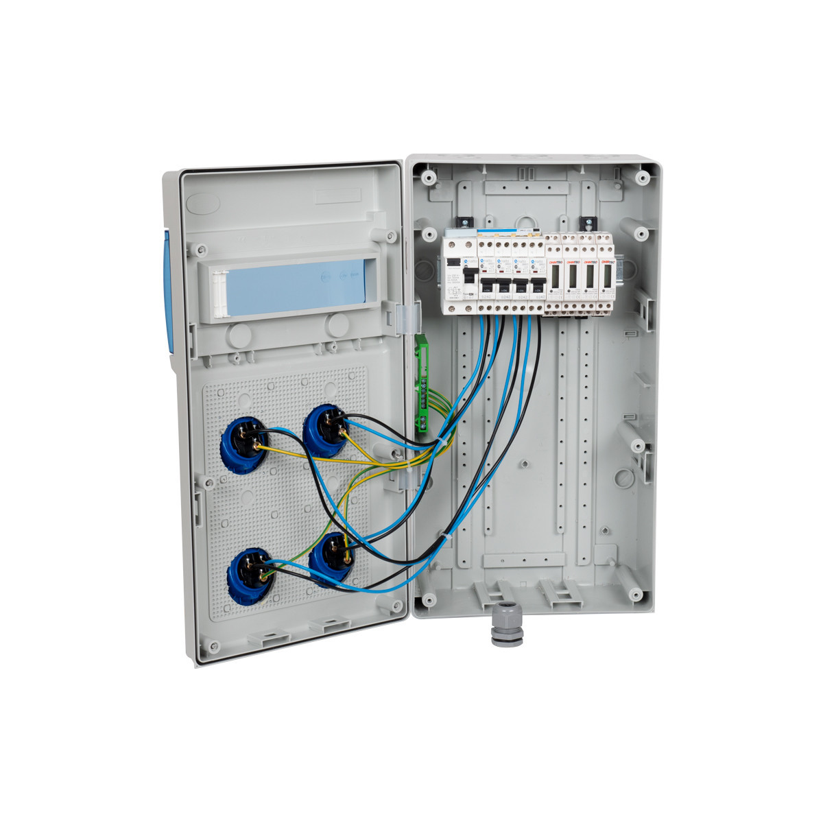 Ce coffret muni de 4 prises indépendantes, est destiné à alimenter tout équipement de caravaning. Borne de raccordement étanche IP65, très robuste avec un traitement anti UV. Conforme aux règles d'installation de la NF C 15-100. Borne assemblée dans notre atelier en France. Un compteur d'énergie est présent sur chacune des prises pour en connaitre la consommation électrique en Kwh.