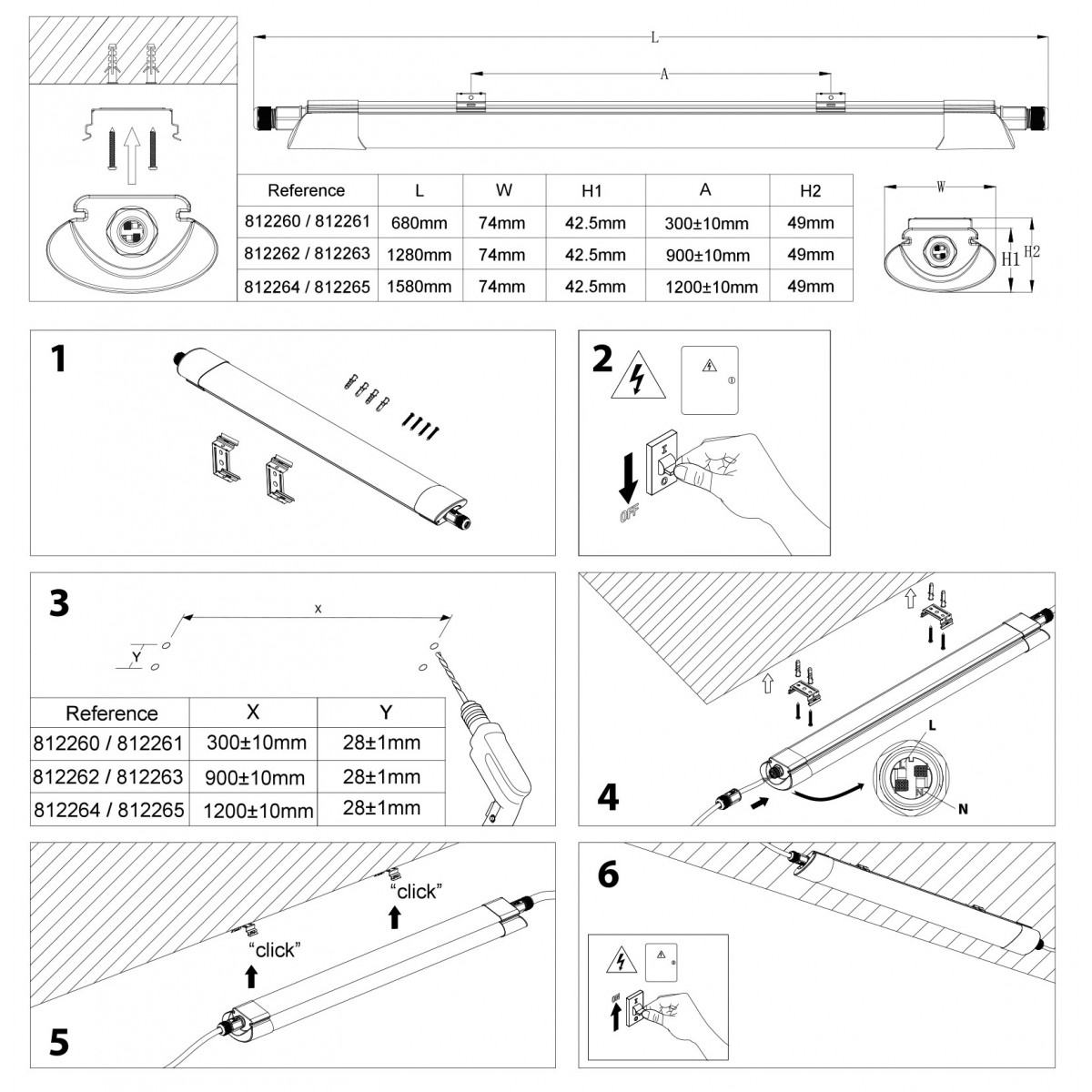 IK08. Pré-câblage traversant (utiliser du câble R2V 2x1,5mm² pour l'installation). 2 presse-étoupes. Entraxe des supports de fixation réglable. Livré avec un bouchon d'étanchéité pour le presse étoupe non utilisé et conserver l'indice IP65. Angle d'éclairage de 120°