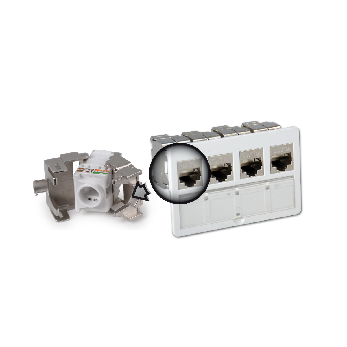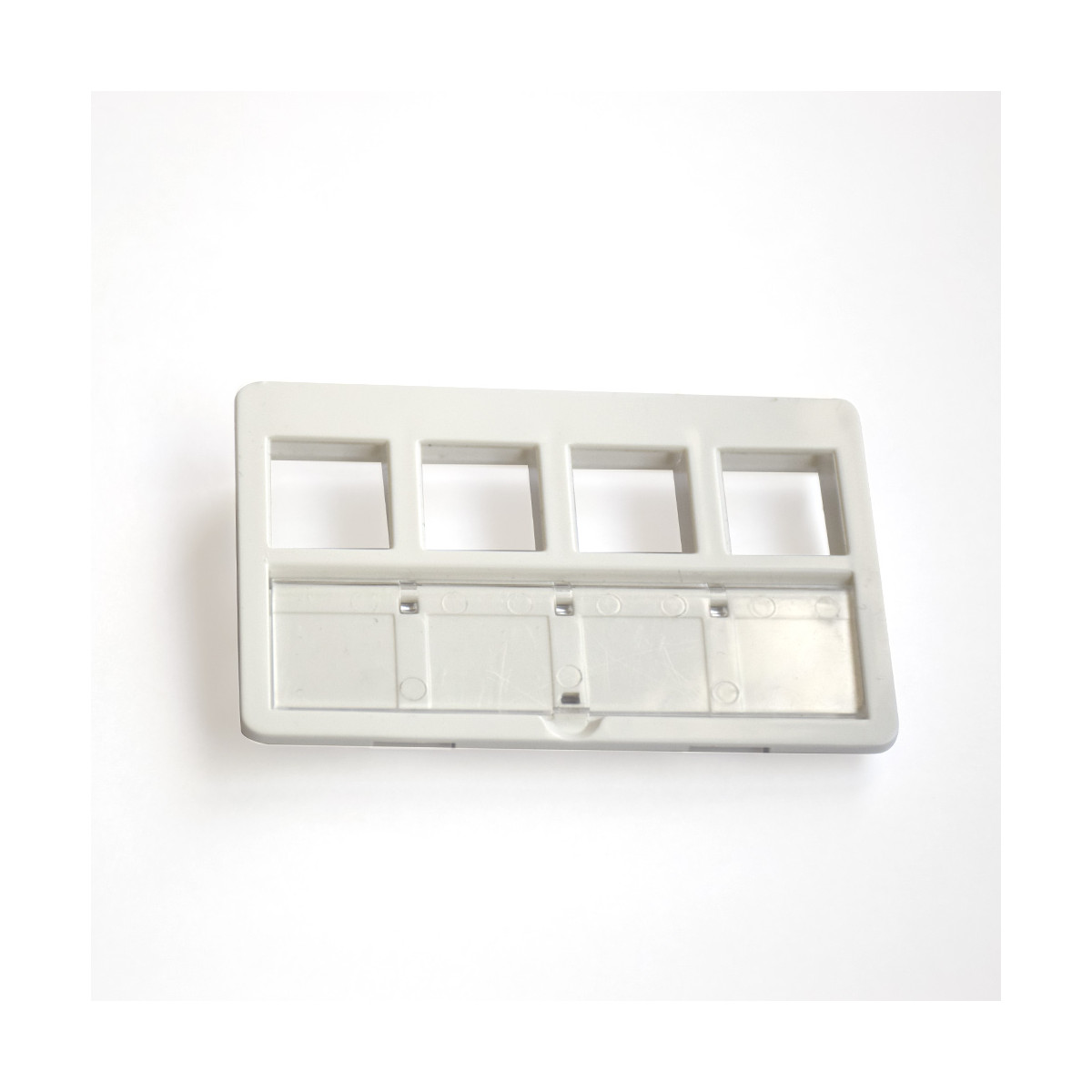 support plastique pour l'assemblage de 4 connecteurs RJ45 (référence 423158) , qui se clipse en façade d'un tableau de répartition.