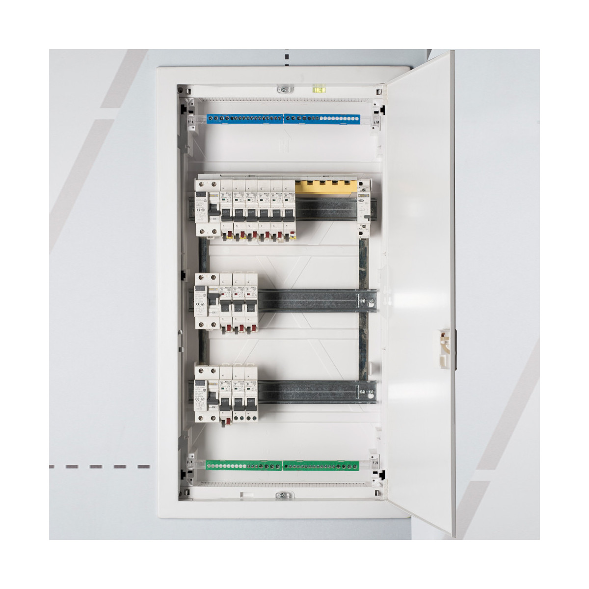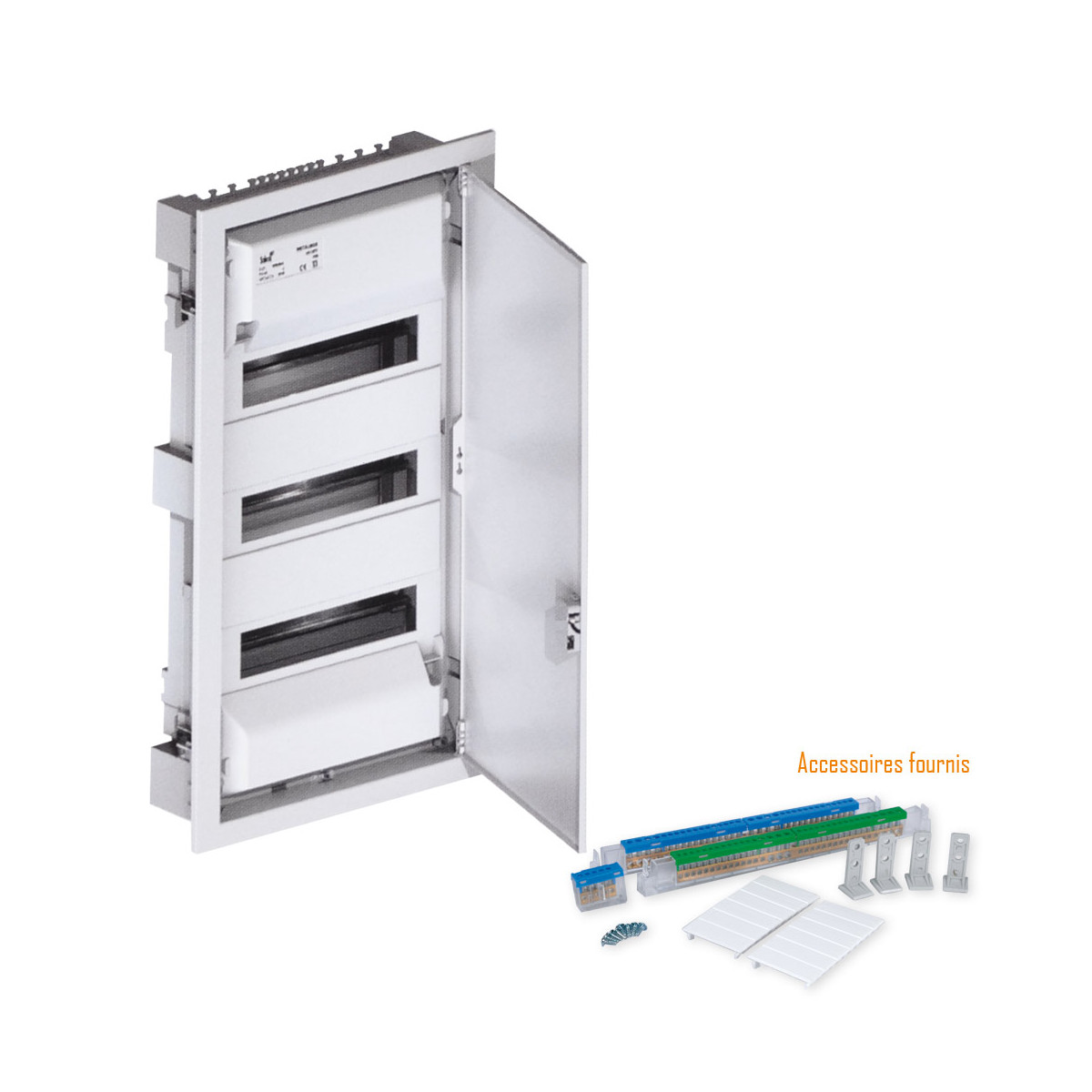 - Porte métallique réversible blanche RAL 9003 avec serrure optionnelle - Visserie pour cloison sèche - bornier de terre et neutre - obturateur - Niveau à bulle intégré pour le montage