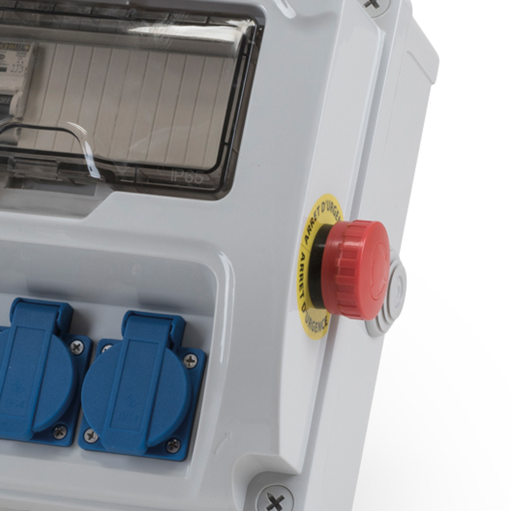 Coffret d'atelier étanche pour vos chantiers. Il est fourni pré-câblé et assure la protection électrique lors de vos travaux. Le coffret d’atelier offre une installation murale pour un usage à plus long terme. Disponible en version monophasée et triphasée. Arrêt d'urgence disponible en accessoire.