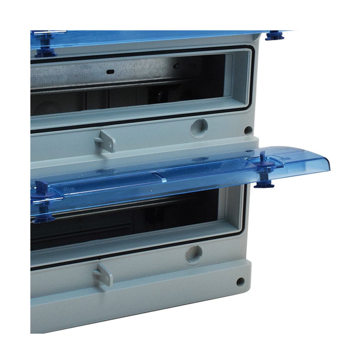Ce tableau électrique étanche OHMTEC nu 1 rangée est prévu pour un montage en saillie. Il est équipé d'une fenêtre étanche à fermeture par 1/4 de tour. Le verrouillage des fenêtres est possible ainsi que le plombage de la façade