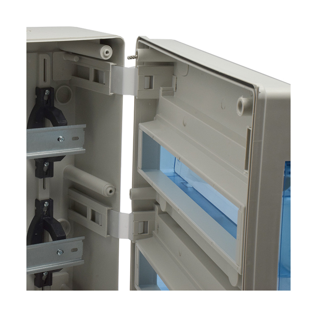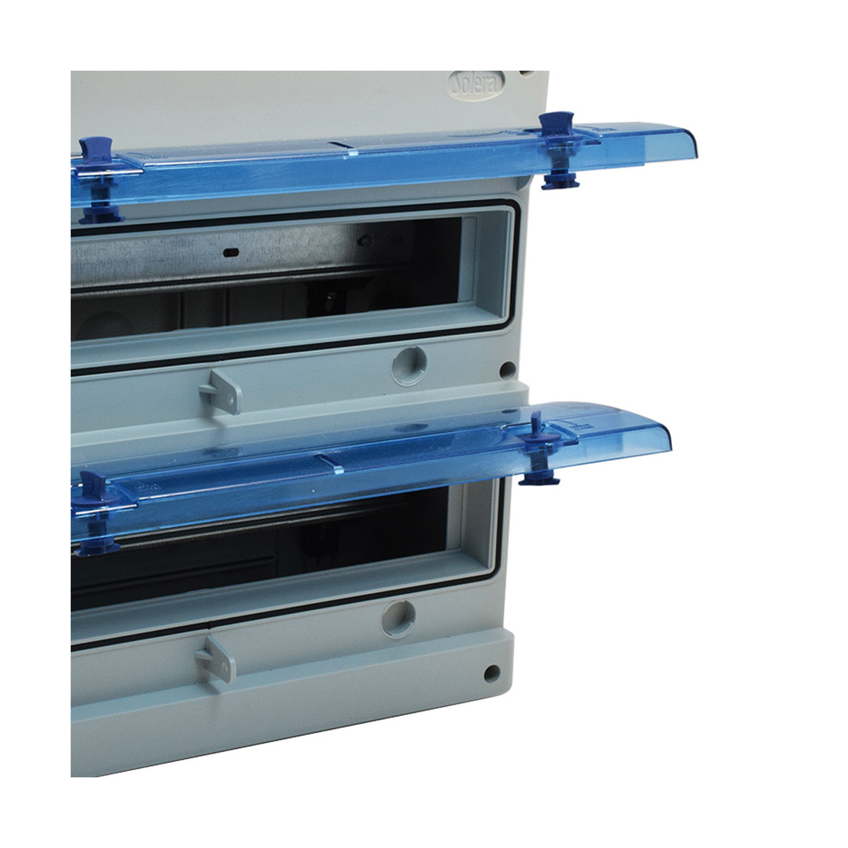 Ce tableau électrique étanche OHMTEC nu 2 rangées est prévu pour un montage en saillie. Il est équipé d'une fenêtre étanche à fermeture par 1/4 de tour. Le verrouillage des fenêtres est possible ainsi que le plombage de la façade