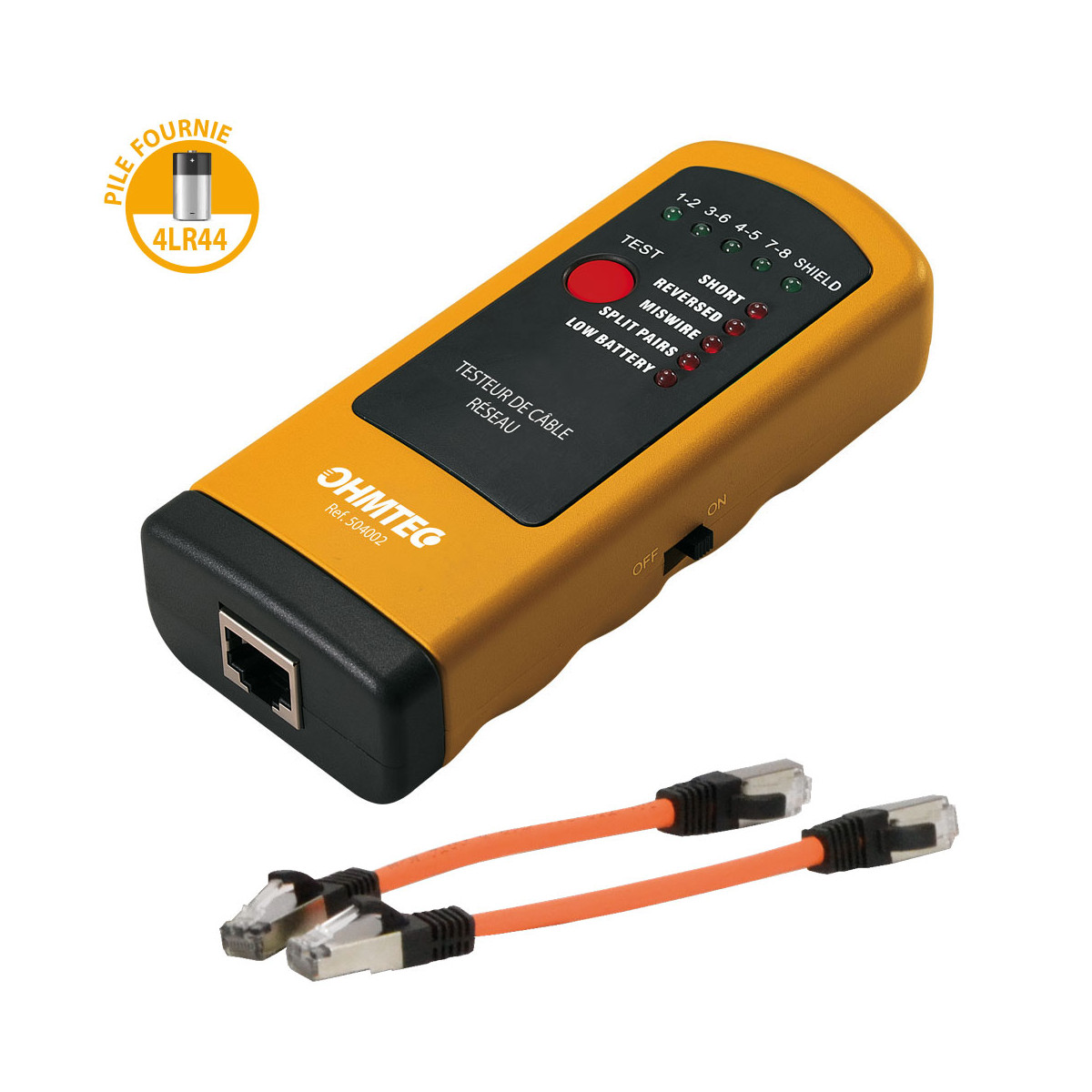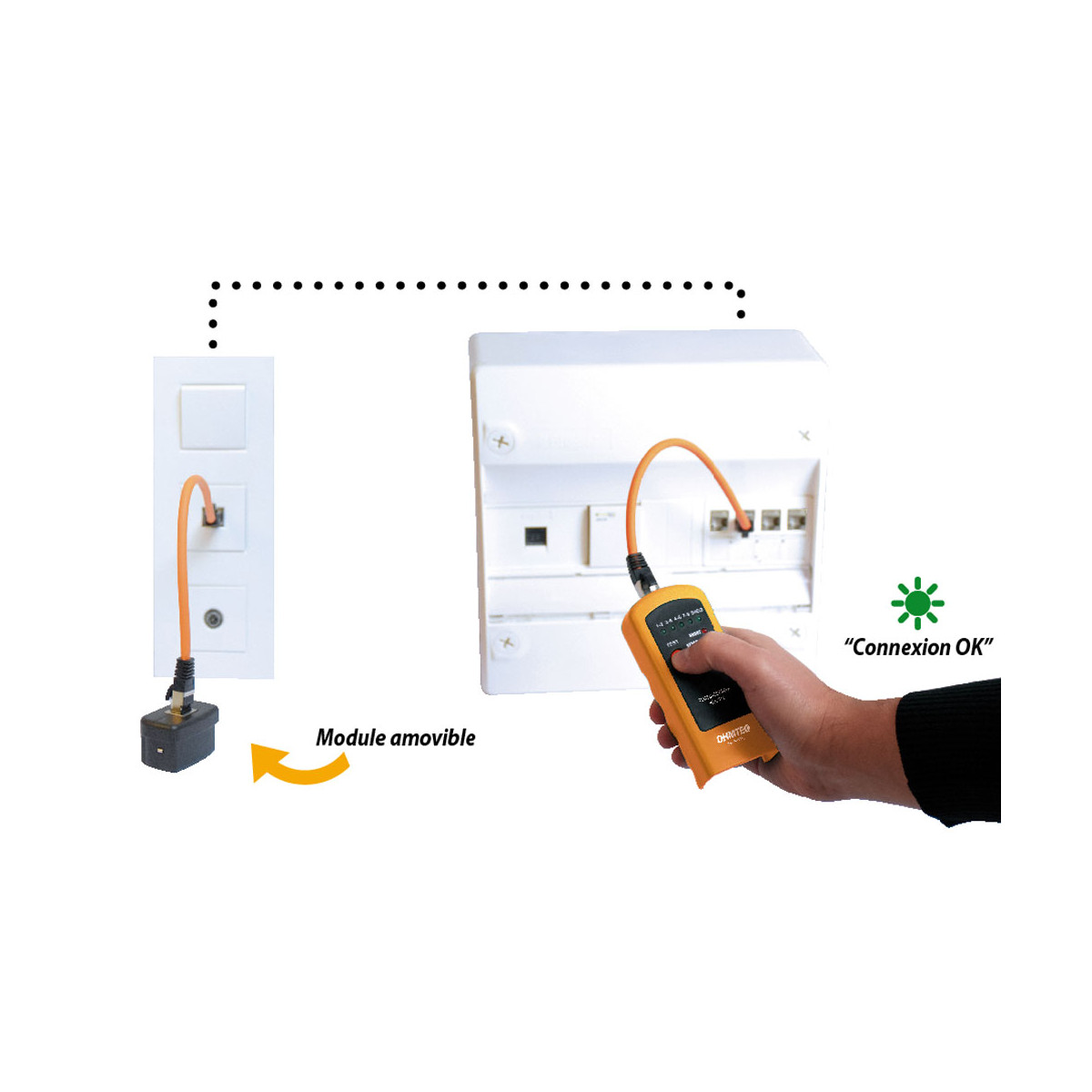 - Testeur muni d'un connecteur mobile avec 2 cables de liaison RJ45 - longueur 15 cm pour la réalisation de la connexion entre le tableau de communication et la prise RJ45 à tester. Trousse de rangement fournie.