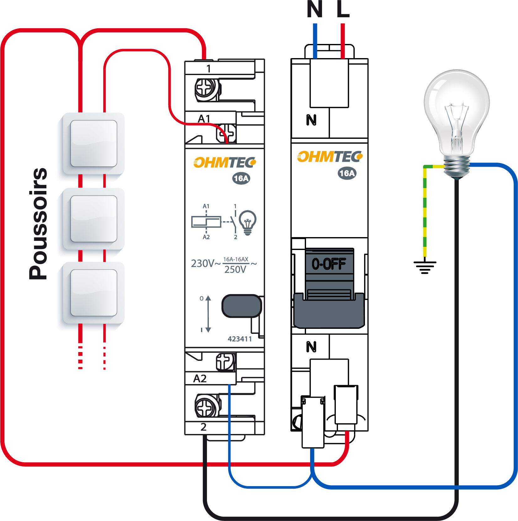 Ce télérupteur électromécanique 16A OHMTEC est un dispositif modulaire permettant d'actionner une charge via un ou plusieurs boutons poussoirs.
